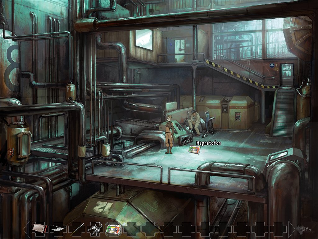 Schodzimy więc do stołówki. Teraz przeszukujemy kurtkę, wyjmując z niej klucze. Wychodzimy i udajemy się przez drzwi na środkowym piętrze na zewnątrz. Gdy będziemy już w miejscu pracy spawacza, udajemy się do biura na górze. Używamy kluczy na szafce 1 - otwieramy ją tym samym i wyjmujemy z niej kasetę. Schodzimy do spawacza i używamy jej na magnetofonie. W ten sposób pracownik wróci do pracy.