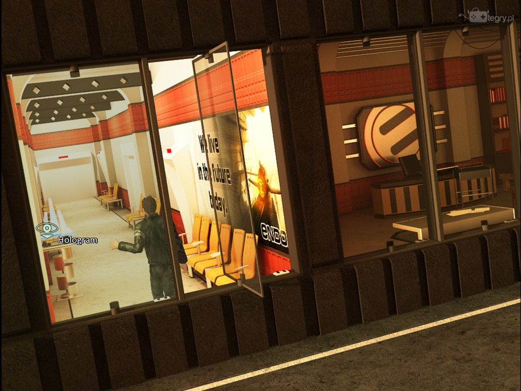 Zauważamy, iż tuż obok drzwi tarasowych znajduje się przycisk do papieru. Podnosimy go i używamy na drucie. Tak wygiętym drutem otwieramy za pomocą pilota okno i dostajemy się na korytarz. Tutaj od razu naszą uwagę przykuwa hologram. Zbliżamy ekran do niego i rozmawiamy z nim. Jak się okazuje, jest to sterowany głosem system, który pozwoli nam w łatwy sposób poruszać się po budynku. Wypytujemy go o położenie magazynu i archwium - te miejsca nas interesują. Jak tłumaczy maszyna, do magazynu można trafić również wejściem awaryjnym. Archiwum co prawda również dysponuje takim wejściem - całe jest jednak otoczone strażnikami (magazyn na szczęście nie).