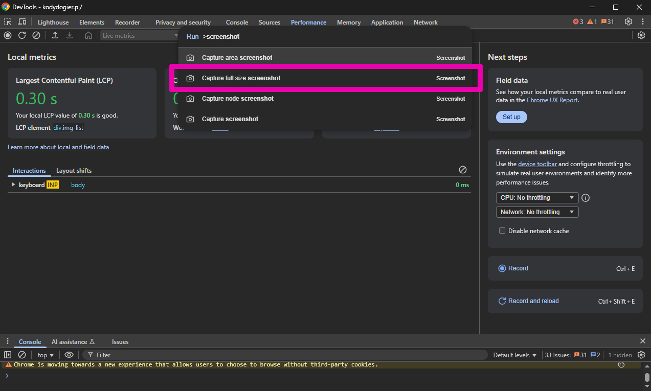 Aby wykonać print screen całej strony internetowej - bez przewijania - w Google Chrome, nie potrzebujesz dodatkowych narzędzi. Choć to nieco skomplikowane, taki zrzut zrobisz z poziomu opcji przeglądarki. Po prostu podążaj za tymi krokami: