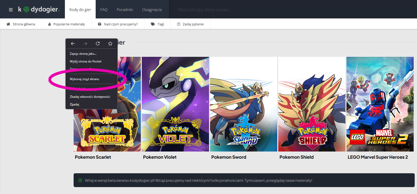 Wśród opcji znajdziesz również możliwość wykonania zrzutu standardowego oraz tego dotyczącego konkretnego obszaru danej strony internetowej.