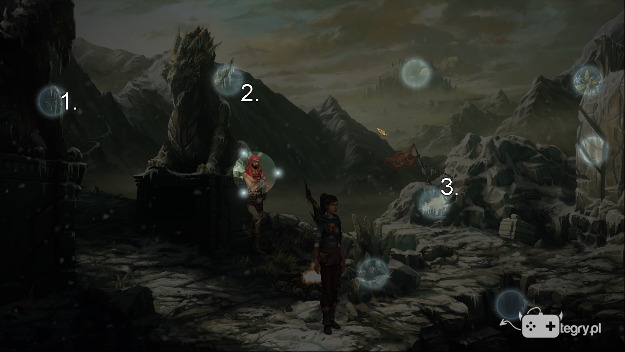 Teraz zajmujemy się Rachwanem - musimy sprawić, by było mu zimno. W tym celu rzucamy zaklęcie Wyślij Wizję na naszyjniku Rachwana (Rachwan's necklace). Gdy pojawi się wybór elementów wizji, wskazujemy na lodowym blasku (#1), soplu lodu (#2) oraz śniegu (#3). Teraz szybko używamy Petryfikacji na trawie (grass), na której klęknie mężczyzna, a następnie nakładamy mu maskę (mask). Zgodnie z obietnicą, laska będzie nam podpowiadać, jakie słowa mamy wypowiadać. Będą to kolejno: