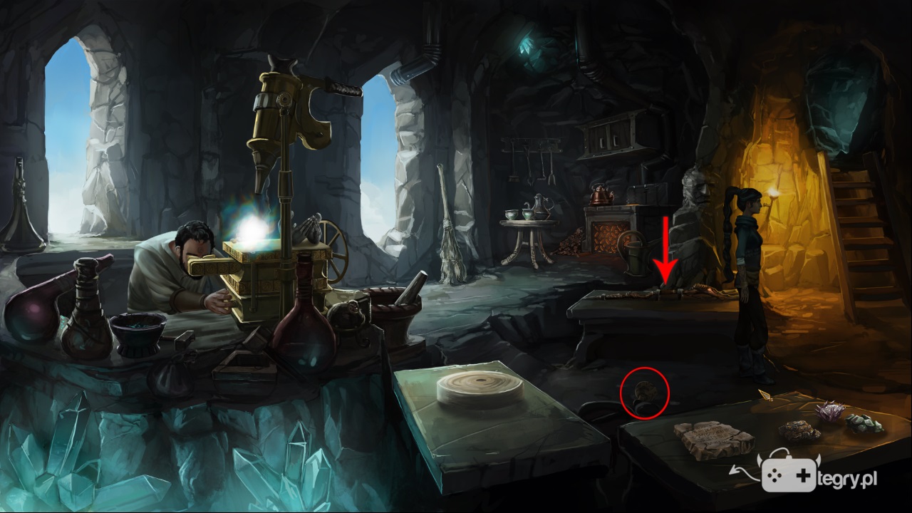 Adept przeprowadza test na nas. Tuż po tym prosi nas o pokazanie mu naszych nowych zdolności. Rzucamy zatem zaklęcie Aktywacji / Deaktywacji na magiczne ustrojstwo (magical contraption). Teraz mężczyzna będzie nas zachęcał do rzucenia drugiego czaru. Tak też robimy. Rzucamy zatem zaklęcie Wizji na czarze, a następnie wybieramy kolejno obrazy kuli ze znakami zapytania (#1), krysztale (#2) oraz kamieniu szlifierskim (#3). Teraz adept każe nam usunąć rubin - okazuje się, że i bez niego maska działa, a my odzyskamy zaklęcie Petryfikacji / Ożywiania. Gdy adept poprosi nas o oddanie maski, właśnie tego zaklęcia używamy na nim. Następnie w naszym ekwipunku łączymy ze sobą zaczarowany rubin (enchanted ruby) z ciemnością (darkness). Z magicznego ustrojstwa zabieramy ponadto rozświetloną kulę (???) - kamienna twarz zacznie coś mówić, a po chwili trafi do naszego ekwipunku w postaci ducha kruszcu (ore spirit). To zaledwie pierwszy z kilku, których potrzebujemy.
