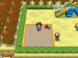Tym razem idziemy w prawo. Docieramy do budynku z czerwonym dachem. Wchodzimy do środka - pierwsza z napotkanych kobiet natychmiast nas uleczy. W prawym górnym rogu łapiemy Rare Candy. Następnie wychodzimy z budynku, który tak właściwie rzecz ujmując jest przedszkolem. Walczymy z trenerką po lewej stronie wyjścia. Pokonujemy również trzech przedszkolaków bawiących się na placu zabaw. W piaskownicy, tuż obok wiaderka, znajdujemy kolejne Rare Candy - dbamy o to, by je podnieść. Teraz możemy udać się w prawą część placu zabaw, by odnaleźć Pokemon Daycare!