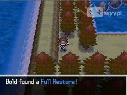 Rozmawiamy z kobietą stojącą w trawach tuż obok, by otrzymać od niej... Potion. Kratkę nad nią i jedną kratkę w lewo znaleźć można ukryty Ultra Ball. Idziemy w lewo, do miejsca, w którym stoi rybak. Wskakujemy do wody i płyniemy w dół. Z konieczności będziemy musieli skręcić w lewo - w końcu jednak dotrzemy do lądu. Na nim idziemy w lewo, łapiąc Full Restore leżące na ziemi.