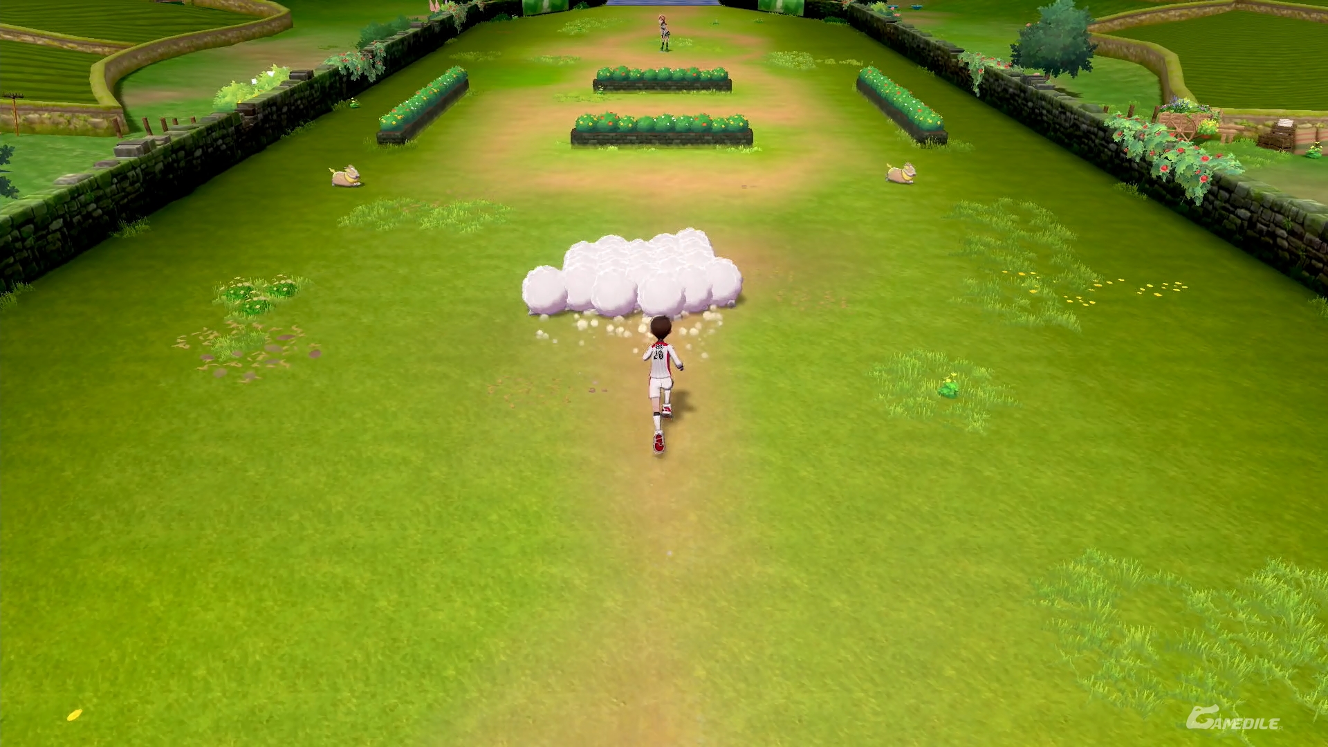 Trzeci obszar został podzielony dwoma żywopłotami. Najlepiej sprowadzić wszystkie Wooloo na jedną stronę, poczekać, aż Yamper będzie z drugiej strony i szybko przeprowadzić owce do celu. Przy okazji walczymy z trenerem - to w końcu darmowe doświadczenie!
