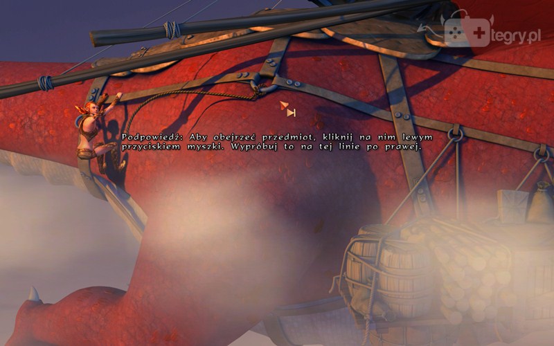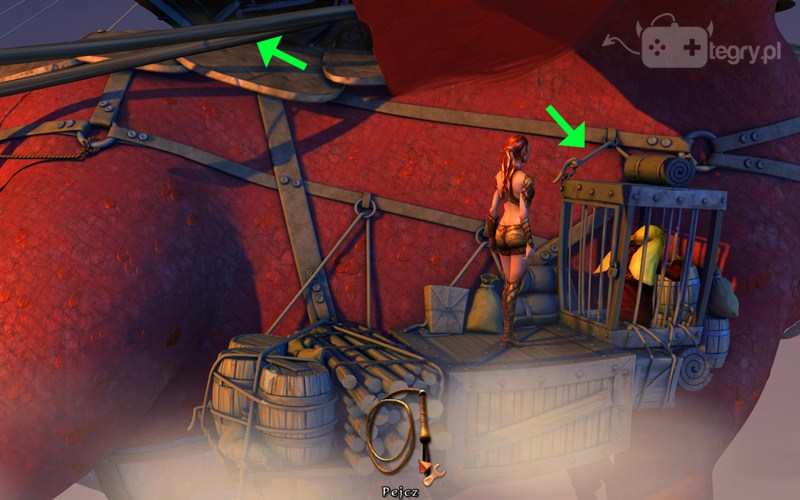 Po rozmowie przyglądamy się linie zabezpieczającej. Okazuje się jednak, że jest zbyt zaciśnięta - być może z pomocą jakiegoś narzędzia udałoby się ją przeciąć. Spoglądamy koniecznie na wspornik - nie dosięgniemy go. Rozmawiamy z gremlinem - mówimy mu o naszych problemach z odwiązaniem klatki i potrzebie pomocy. Otrzymamy od niego pejcz. Może nam on posłużyć jako lina. Otwieramy ekwipunek, przesuwając myszkę w dolną część ekranu, wybieramy pejcz i używamy go na wsporniku. Tym samym trafiamy na górną część smoka.