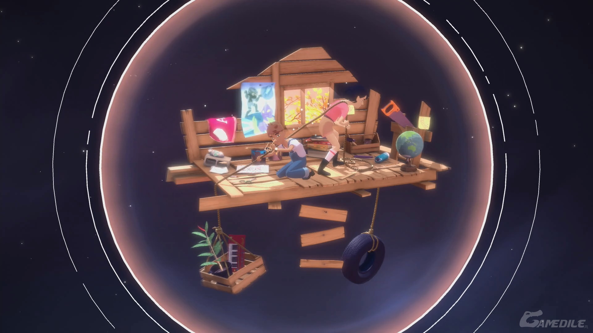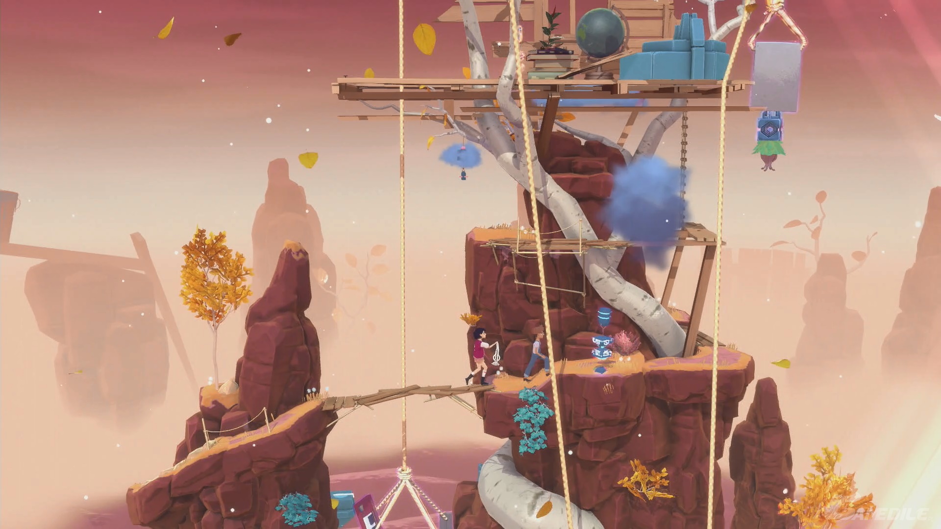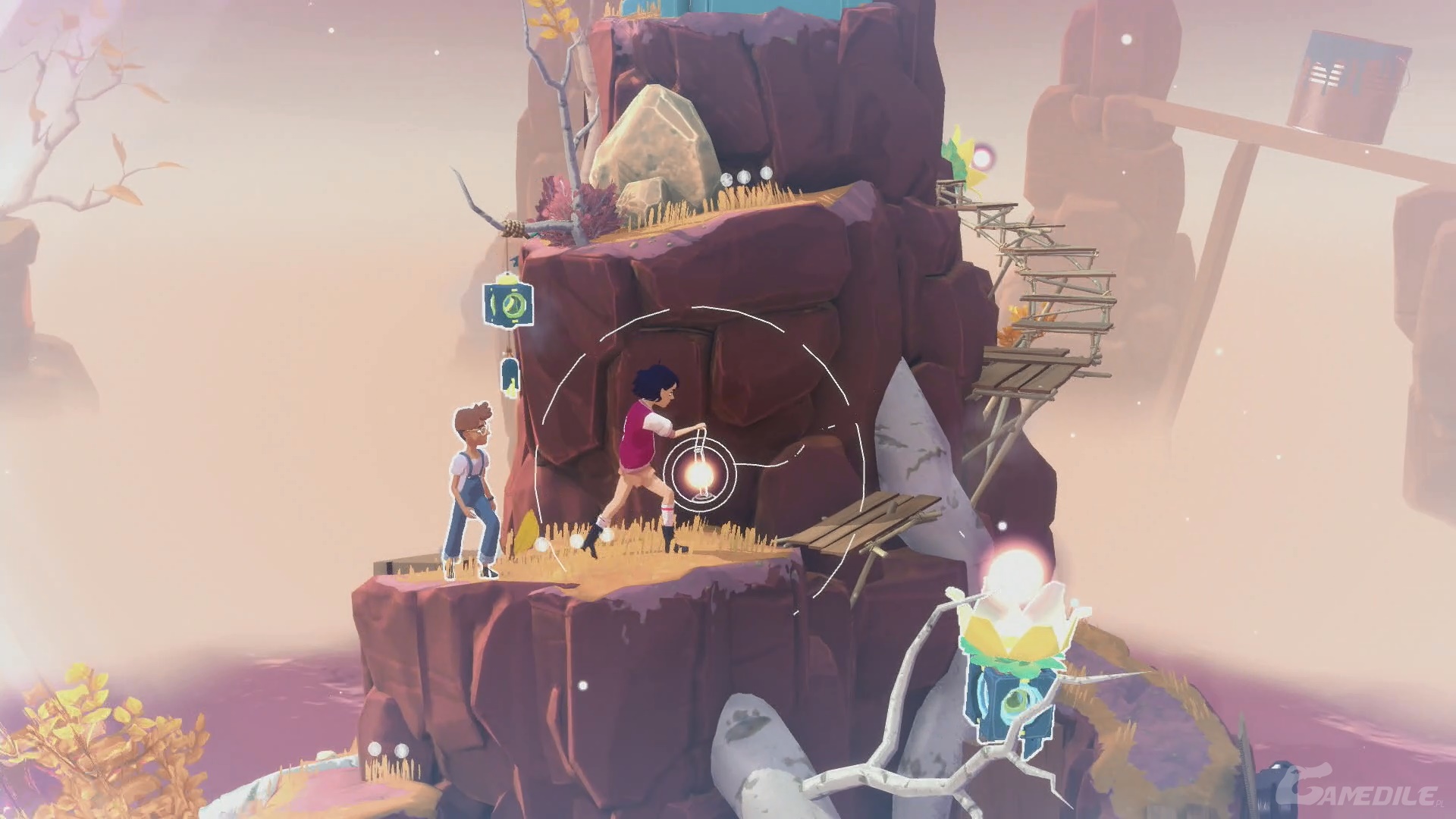 Idziemy w prawo, używamy dzwonu i, po rozdzieleniu się bohaterów, umieszczamy latarnię w trzecim pudle od lewej. Cofamy czas, by ta zabrała światło, a następnie przyspieszamy go, by przyniosła go Arinie. Zabieramy je i idziemy w prawo - tworzymy most. Nasz bohater do nas dołączy. Udajemy się na sam szczyt, obserwując lot wszystkich pudełek.