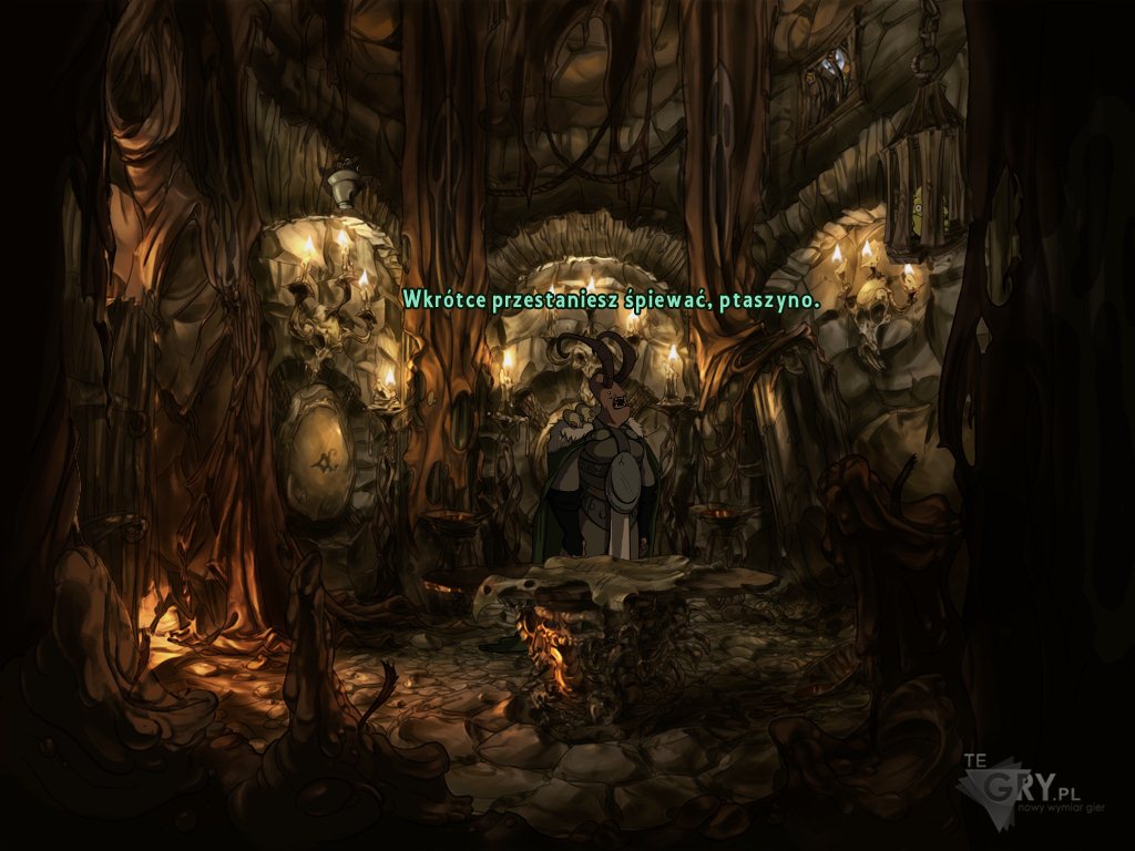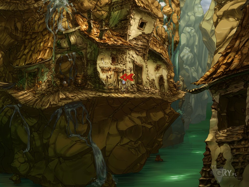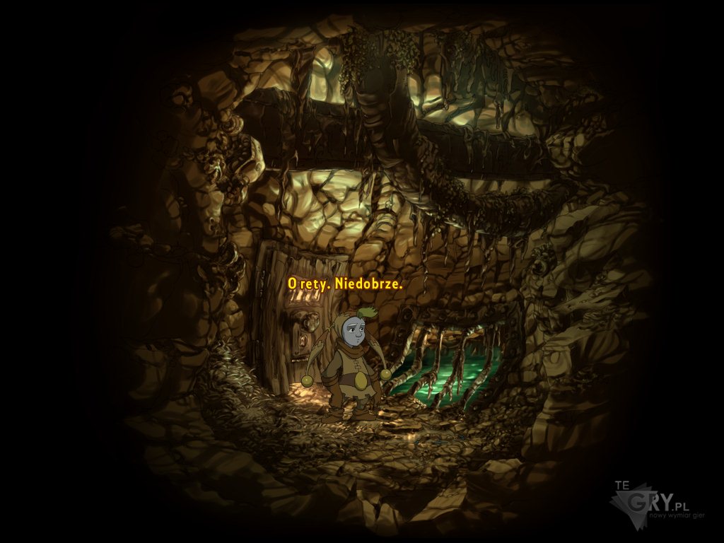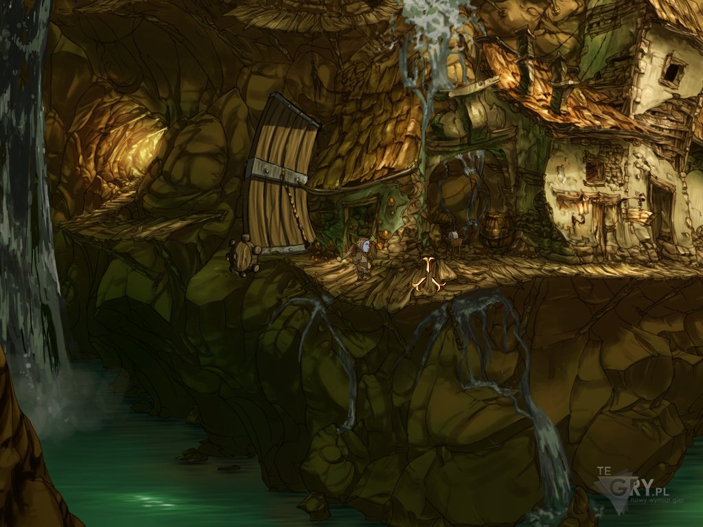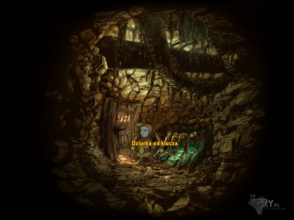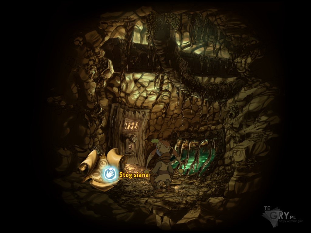 Zajmijmy się teraz opuszczaniem mostu zwodzonego widniejącego obok drzwi do więzienia - możemy to zrobić poprzez przecięcie sznura. Nasz tępy nóż raczej się do tego nie nada. Ostrzymy go na kamieniu szlifierskim i dopiero wtedy używamy, opuszczając most. Przechodzimy przez przejście, znów trafiając do jaskini. Tutaj znowu spoglądamy przez okno - zauważymy Spota! Został uwięziony w klatce! Teraz Loucaux grozi mu, że stanie się kolejną potrawą kucharza - jak tylko ten dostanie zupę pleśniową i źle ją oceni. Cóż, nie możemy ryzykować - musimy sami sporządzić ten posiłek.