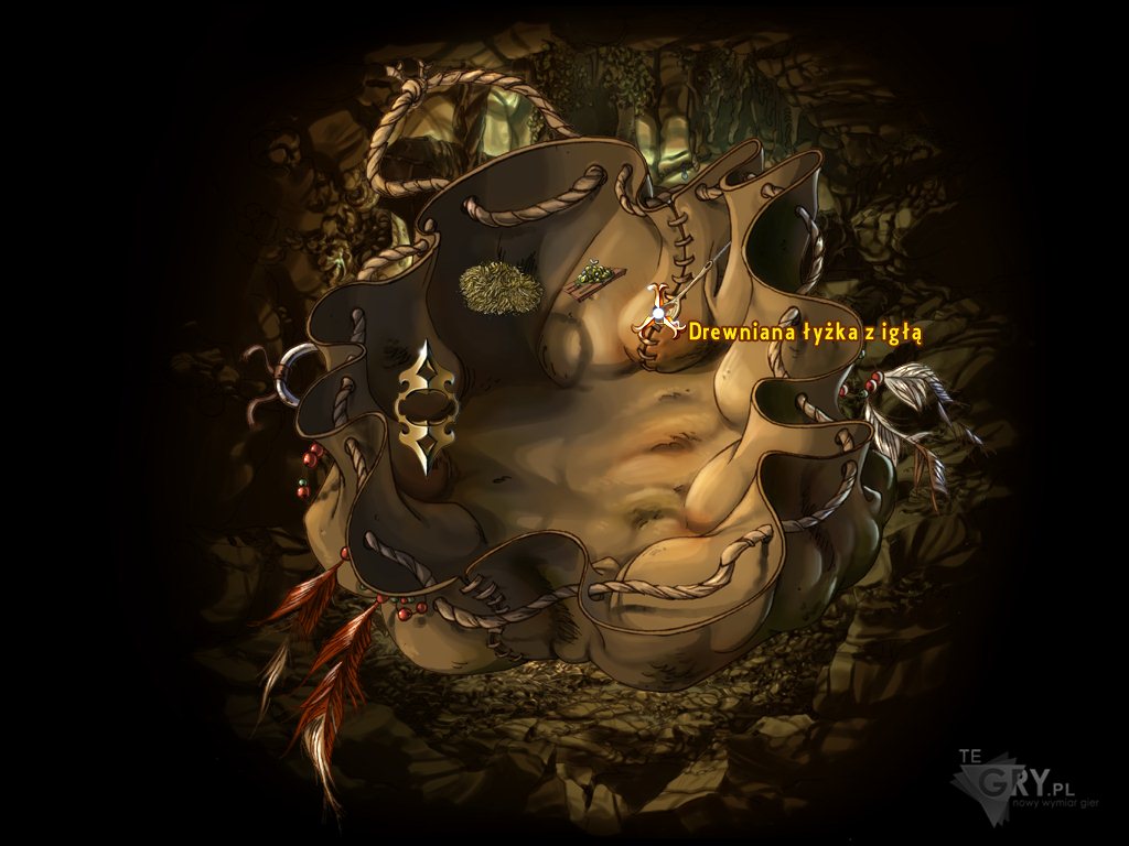 Wracamy do ekranu jaskini i używamy drewnianej łyżki z igłą na węźle, wiążącym sznur na rogu, którego wcześnie użyliśmy do powalenia strażnika. Podnosimy sznur oraz monetę, która wcześniej została zostawiona przez strażnika. Teraz wychodzimy na zewnątrz i kierujemy swoje kroki do kuchni (jej szyld oglądaliśmy wcześniej).