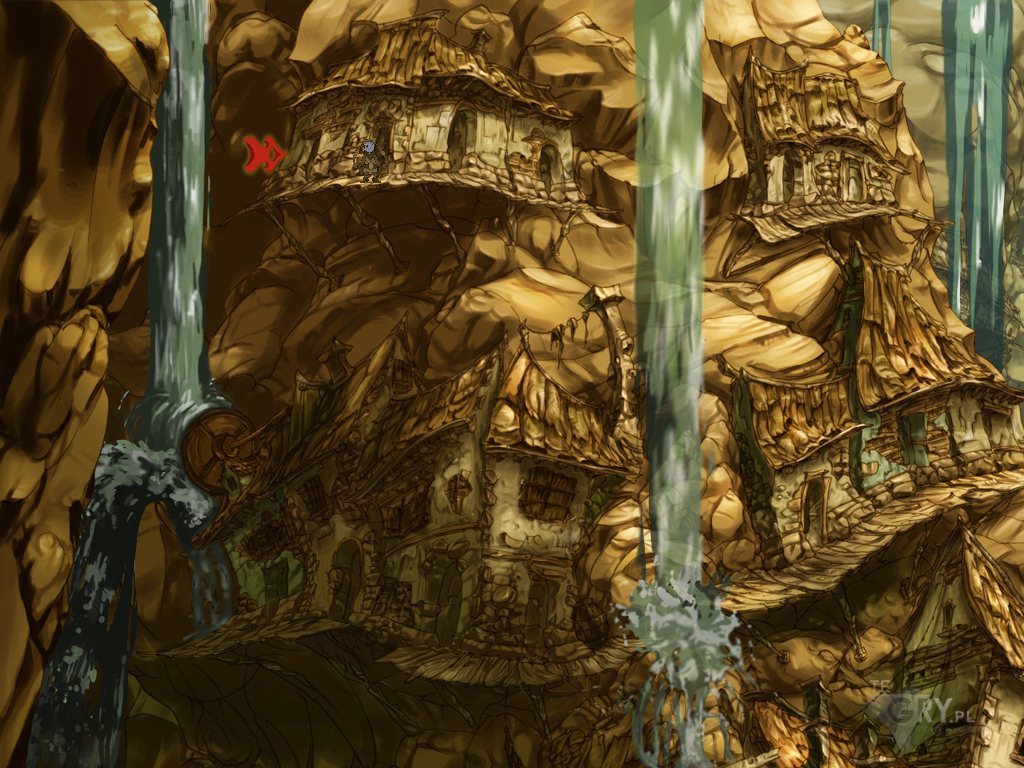 Trafiamy na swoisty pomost. Odczytując szyld kuchenny dowiadujemy się, że znajduje się tam Komnata Obżarstwa. Niezbyt zachęcająca, mimo wszystko. Wchodzimy do korytarza po prawej stronie (ostatnie drzwi po prawej), trafiając tym samym w lewy górny róg tej małej wioski. Teraz schodzimy korzystając z drzwi po lewej stronie tego budynku. Pojawimy się lewymi drzwiami po prawej stronie. Idziemy w drzwi po prawej, tym samym trafiając do zbrojowni.