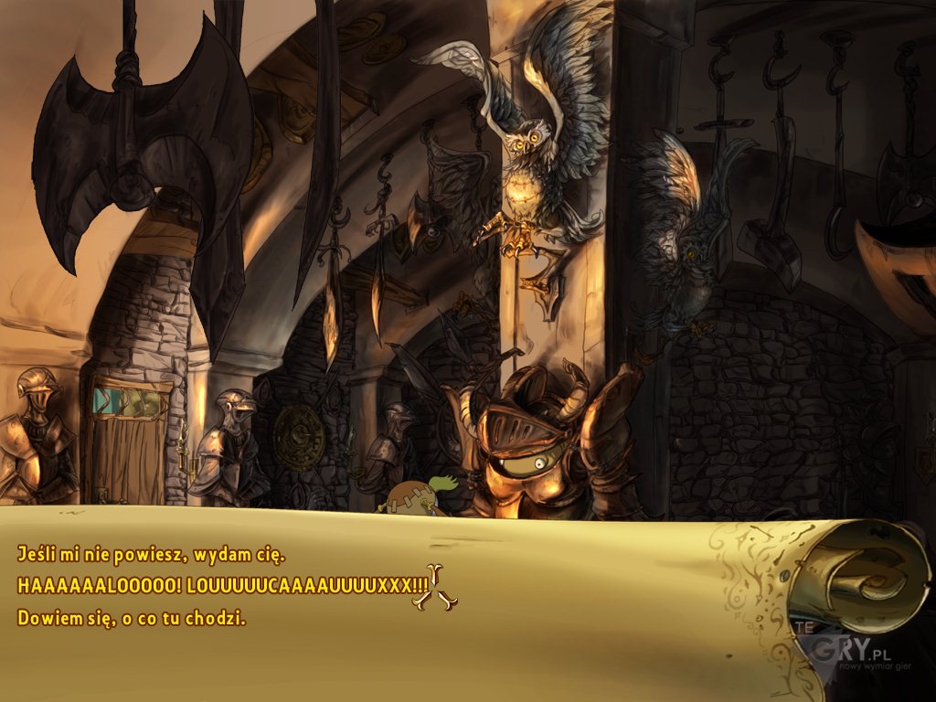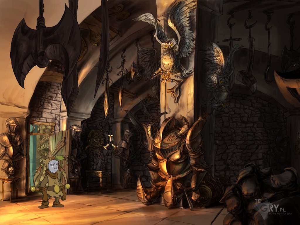 Od razu po wejści zauważamy, iż coś schowało się w jednej zbroi. Spróbujemy z nią porozmawiać. Na pytanie, czy tam ktoś jest słyszymy odpowiedź "Nie". To wszystko wyjaśnia! Tylko nam się zdawało! Zabieramy kij leżący koło zbroi, w której nikogo nie ma :) Następnie zabieramy również nóż oraz łuk ze ściany po lewej stronie. Teraz zamykamy drzwi, by osobnik chowający się w zbroi myślał, że wyszliśmy. Mamy go! Dowiadujemy się, że to kucharz. Rozmawiamy z nim, w końcu grożąc mu, że powiemy jego szefowi, którego imię to Loucaux, że wiemy gdzie jest kucharz. Dowiadujemy się od kucharza, że ulubionym przysmakiem Loucauxa jest zupa pleśniowa. Kucharz zdradza nam przepis (po kilku wyzwiskach i groźbach rzuconych w jego stronę). Przepis to: coś z powietrza, coś z ziemi, coś z wody i coś z siebie. Teraz wychodzimy z pomieszczenia drzwiami po lewej i udajemy się w drzwi po lewej stronie. Teraz wchodzimy w drzwi tuż po prawej, znowu trafiając na sam dół.