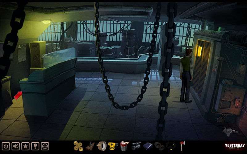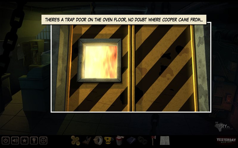 Przeszukujemy kosz po lewej stronie, by znaleźć w nim kabel (cable). Sprawdzamy również skrzynkę zawierającą siekierę (axe), która ma służyć ludziom w nagłych wypadkach. Używamy płótna (canvas) na owej skrzynce, tym samym tłucząc szybę (bohater oplata rękę płótnem i wybija ją). Zabieramy siekierę ze środka i zmierzamy wyjściem na środku (z lewej strony siekiery). Znajduje się tutaj wielki piec (oven) - bohater zastanawia się, co mogą w nim palić. Po wciśnięciu przycisku otwierającego okazuje się, że nie ma mocy.