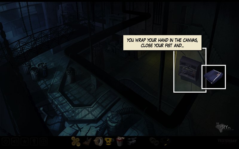 Wygląda na to, iż dostanie się do pokoju z generatorem nie będzie takie łatwe i z pewnością znajduje się w nim jakaś klapa lub zapadnia. Bohater zapala światło, dowiadując się, że Boris ciągle siedzi w środku. Na panelu wciskamy jeden z trzech zielonych przycisków (pod przełącznikami z literami), ten odpowiedzialny za piec (Oven), a następnie opuszczamy widok panelu. Wciskamy czerwony przycisk widniejący obok drzwi od pieca - otwierając drzwi zauważamy jednak, iż ciągle płonie za nimi ogień. Używamy płótna (canvas) na owych drzwiach.