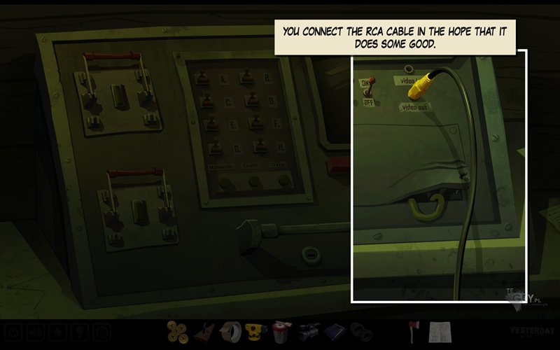 Za biurkiem po lewej znajduje się szafka - jest ona zamknięta (nie przechodzimy do widoku panelu). Aby ją otworzyć używamy siekiery (axe). Zabieramy plany (plan) do jakiegoś urządzenia. Przybliżamy biurko po lewej stronie (pojawi się strzałka), by zauważyć główny panel sterujący. Zauważamy, iż monitor jest pęknięty, a panel pośrodku przypomina ten zawarty na pozyskanym przed sekundą planie. Zauważamy trzy przyciski pod wszystkimi przełącznikami, odpowiedzialne za zasilanie ogrodzenia, głównych drzwi i pieca. Pod monitorem znajdują się dwa gniazda - wejściowe i wyjściowe do video (video in oraz video out). Na tym drugim używamy kabla (cable), wtykając go do środka.