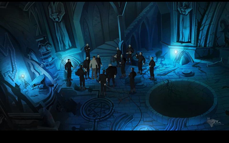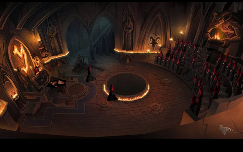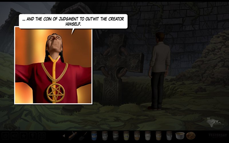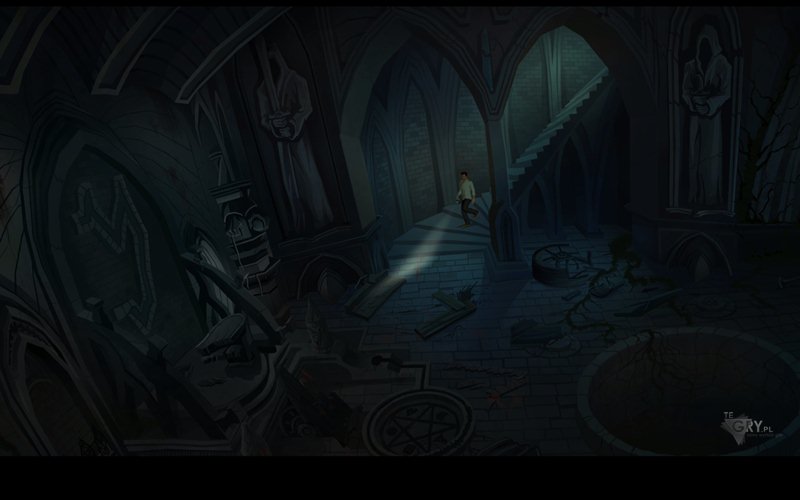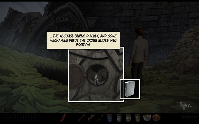 Używamy soli (salt) na górnej części krzyża. Bohater wsypuje ją do odpowiednio ukrytego pojemnika - uruchamia tym samym jakiś nieznany mu mechanizm. Otwór w prawym ramieniu krzyża jest zamknięty. Używamy noża (knife), by go otworzyć, a następnie wlewamy do niego nieco rtęci (mercury). Znów jakiś mechanizm się oswobadza. Do pojemnika w lewej części krzyża wsypujemy trochę siarki (sulfur), a kapkę alkoholu (alcohol) wlewamy do pojemnika w dolnym ramieniu krzyża, słysząc wyraźnie jakiś mechanizm. To dobry znak. Podpalamy zapalniczką (lighter) dolny pojemnik z alkoholem, by dokończyć dzieła. Naszym oczom ukażą się teraz schody. Bohater sam zejdzie na dół.