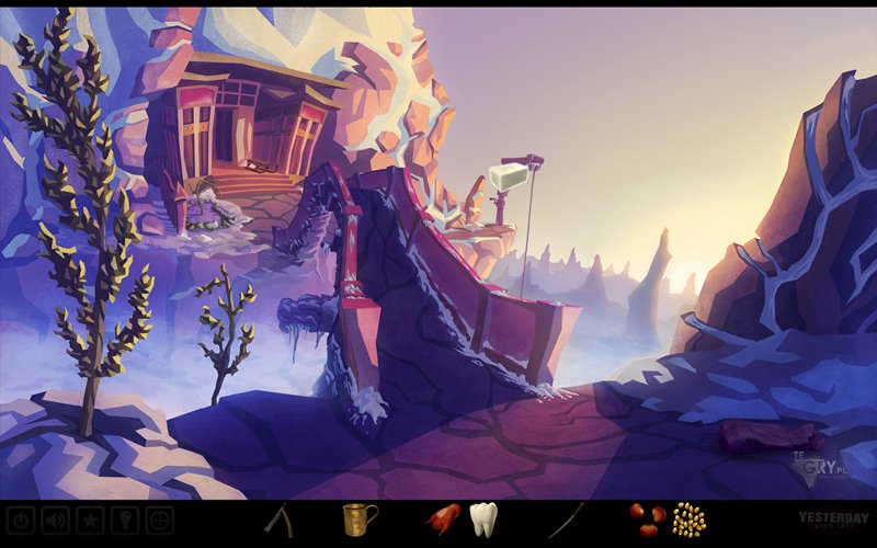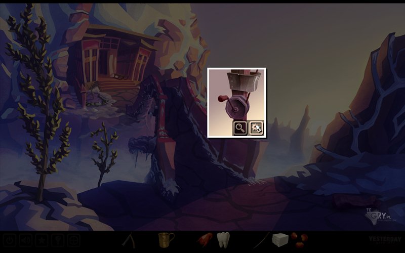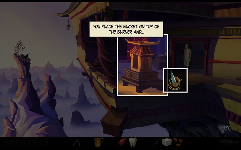 Idziemy w prawo, do strefy z dzwonem i zabieramy więcej ziarna (corn) z worka nieopodal. Jego również używamy na ścianie - tym razem po podleceniu ptak zostawi za sobą nasiona kwiatu prawdy (truth flower seeds) - bohater sam je zabierze. Wychodzimy na zewnątrz przez drzwi na środku. Trafiamy na most. Używamy masła jaka (yak butter) na żurawiu po prawej stronie mostu (w górnym rogu), tym samym oliwiąc go. Przybliżamy żurawia i przekręcamy korbę. Pojawi się koszyk (bucket), który zabieramy przy użyciu naszej katany.