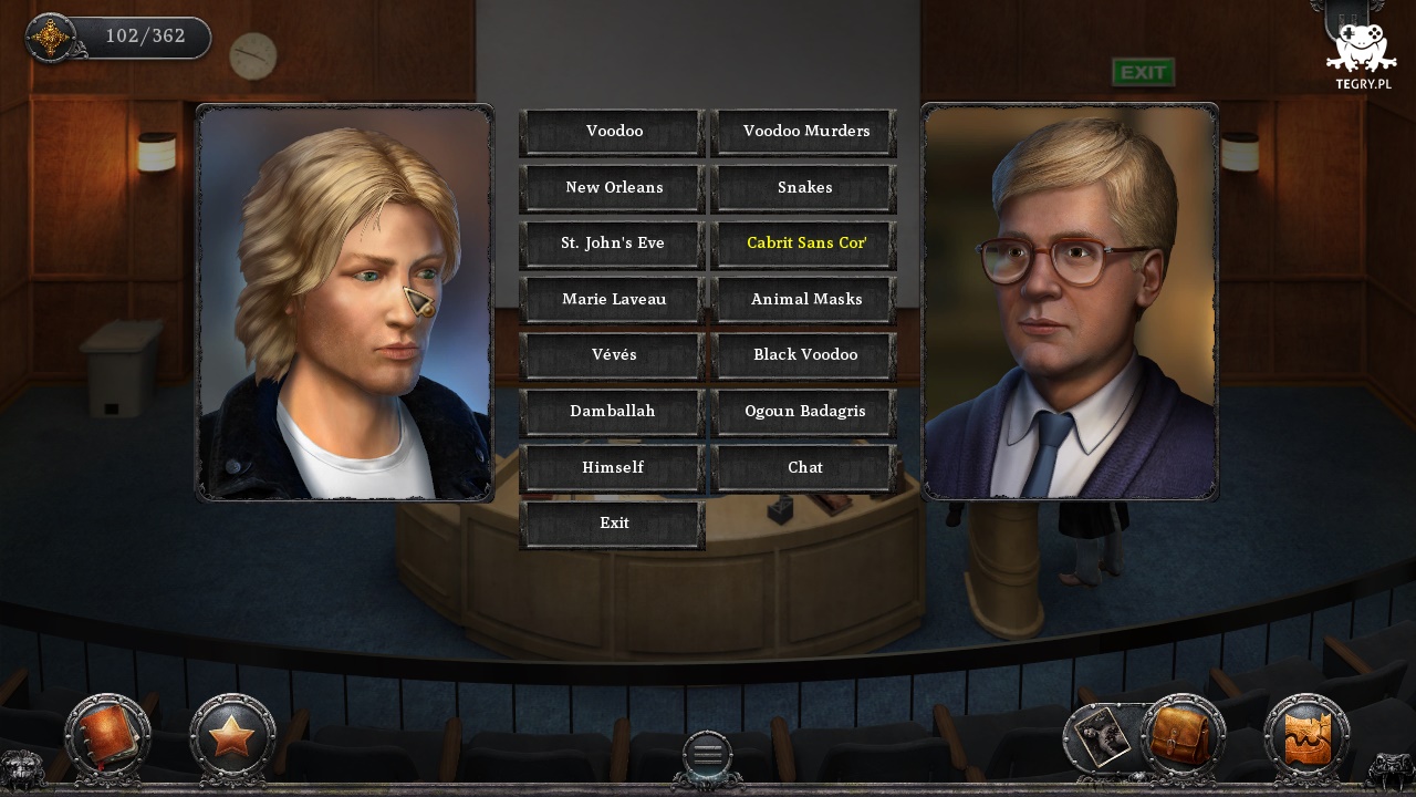 Wizyta rozpocznie się od wykładu profesora i drzemki Gabriela. Po scence pokazujemy Hartridge'owi zrekonstruowane veve oraz fotografię ofiary morderstwa. Pytamy także o zwrot Cabrit Sans Cor'.