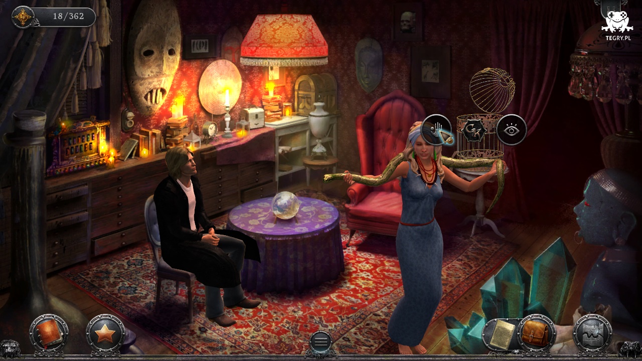 Na miejscu pytamy Magentię o wigilię świętego Jana (St. John Eve), węże (Snakes) oraz Grimwalda i prosimy, by pokazała nam jak tańczy (Show me). W tym czasie klikamy na klatkę, aby wejść w posiadanie skóry węża (Snakeskin). Przyglądamy się jej w ekwipunku aby wykluczyć kobietę z kręgu podejrzanych.