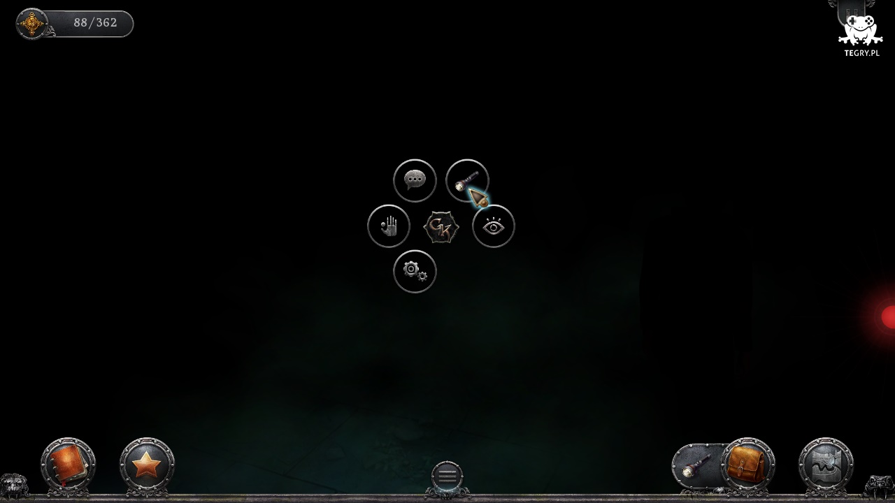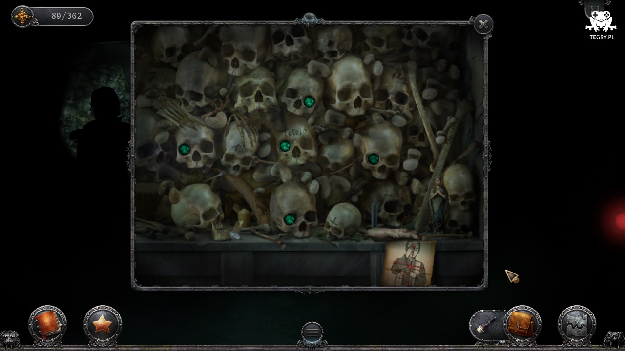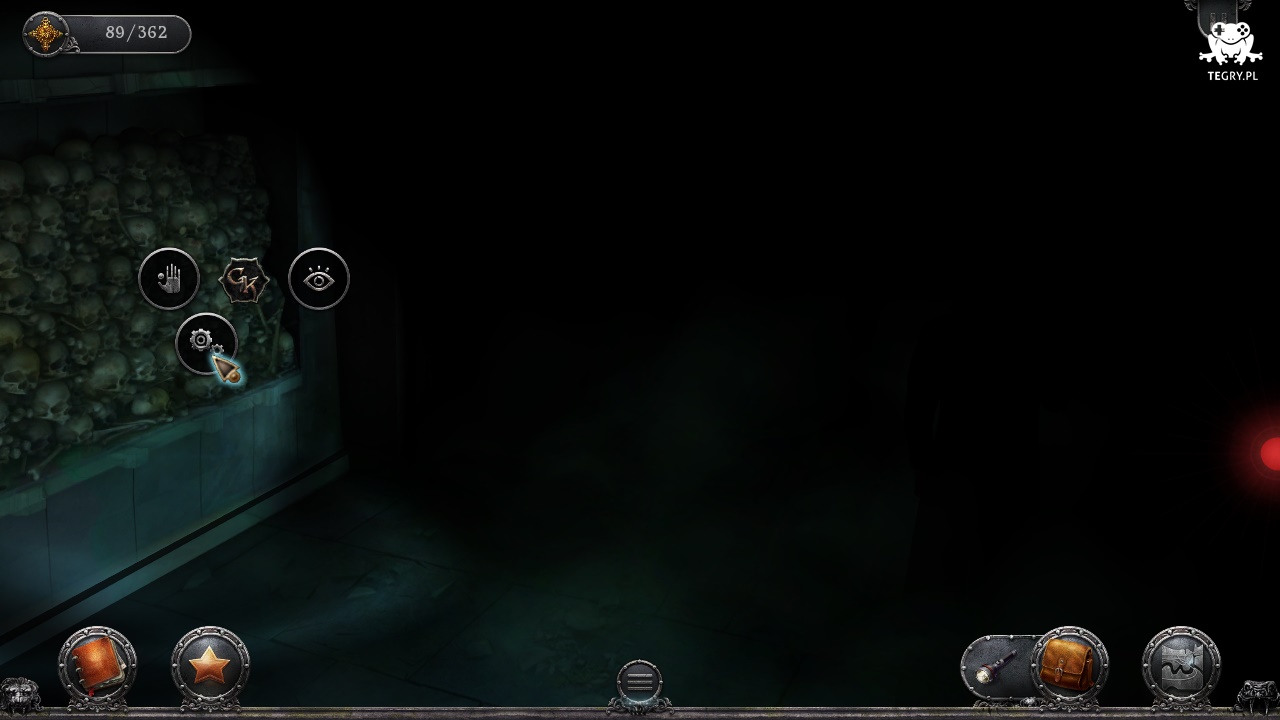 Lądujemy zatrzaśnięci w środku. Otwieramy ekran ekwipunku i wybieramy z niego latarkę, której używamy na ciemności (Darkness). Wodzimy snopem światła po krypcie, interesuje nas miejsce pochówku po lewej stronie (Ossuary), któremu przyglądamy się z bliska wybierając opcję trybów.
