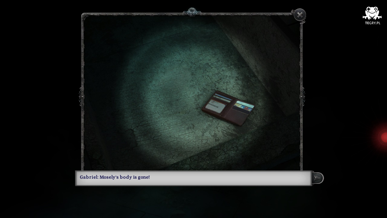 Wysunie się szuflada w środkowym rzędzie, zaglądamy do niej za pomocą ikony trybów, a po krótkiej scence wykonujemy tę operację jeszcze raz. Ze środka zabieramy portfel Mosely'ego (Wallet). Otwieramy go w ekwipunku aby otrzymać kartę kredytową (Credit Card). Klikamy czerwony przycisk po prawej stronie, aby opuścić kryptę. Jedziemy do księgarni.