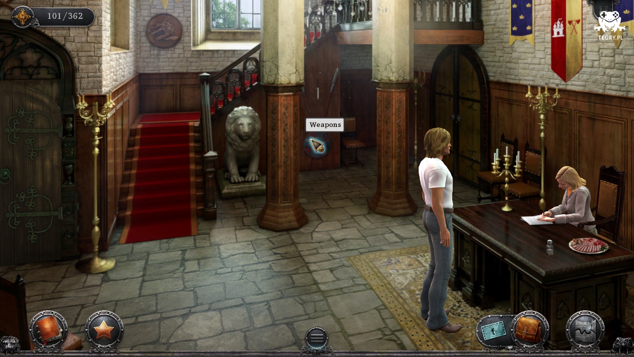 Następnie przyglądamy się broniom wiszącym pod schodami, tuż obok rzeźby lwa. Zabieramy sztylet (Dagger). Odwiedzamy teraz kaplicę (Chapel), do której prowadzą drzwi po prawej. Wewnątrz przyglądamy się witrażowi, ołtarzowi oraz pulpitom po lewej i prawej stronie. Opuszczamy kaplicę i korzystamy ze schodów.