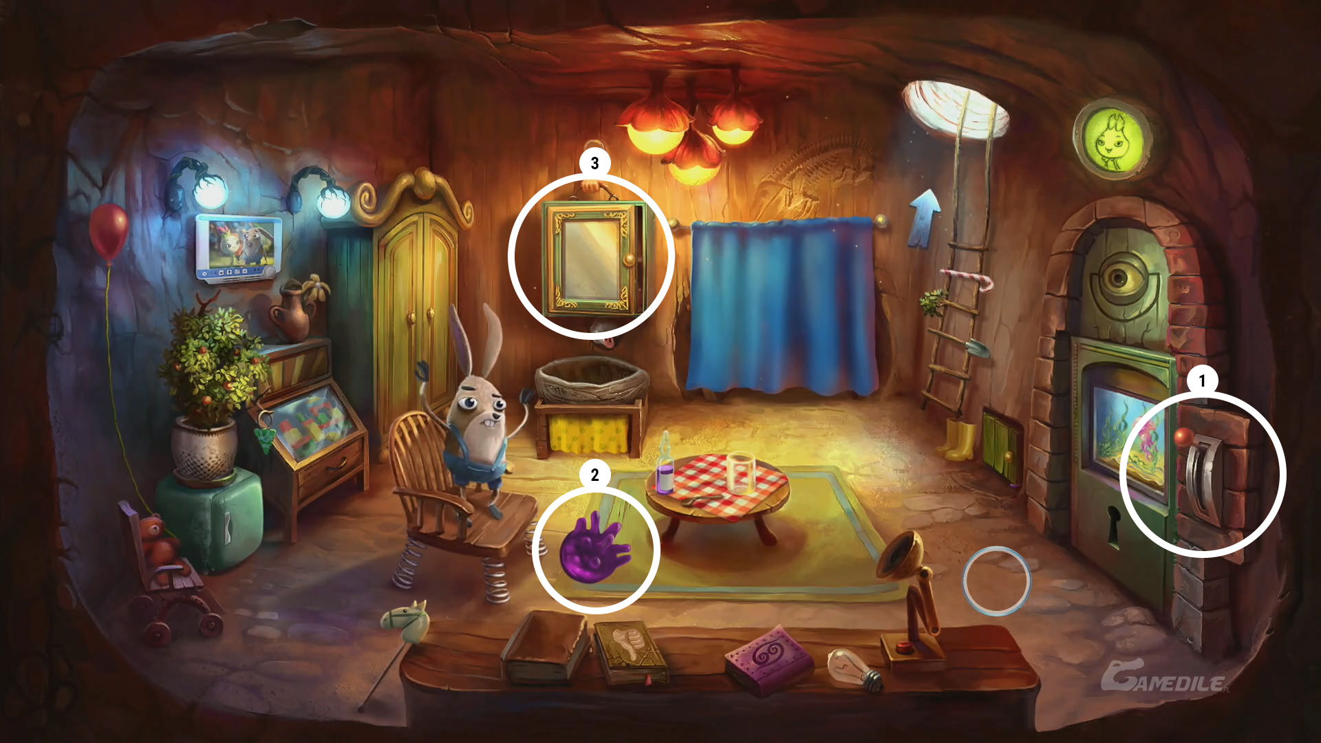 Budzimy się w króliczej norze. Gdy już uzyskamy kontrolę nad naszym bohaterem, pociągamy za dźwignię 1 po prawej stronie. Z panelu po prawej wysunie się maszyna, do której wkładamy uprzednio podniesioną z ziemi maź 2. W maszynie pojawi się miejsce na butelkę z nieokreśloną substancją. Otwieramy szafeczkę 3 wiszącą nad zlewem i podnosimy z niej czerwoną butelkę. Tę wkładamy do maszyny i obserwujemy, co się dzieje.
