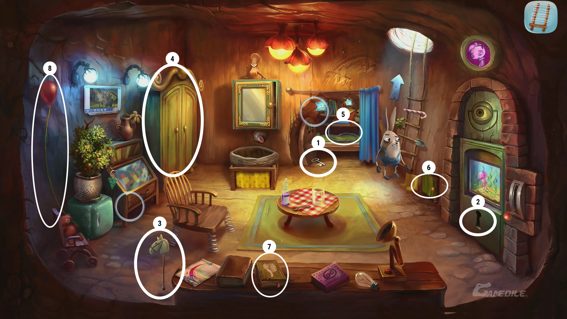 Pierwszą linkę 5 odcinamy z latawca znajdującego się za odsłoniętą wcześniej kotarą, korzystając ze znajdującej się w szafeczce nad zlewem brzytwy. By znaleźć drugą 6, otwieramy drzwiczki koło drabiny. Trzecia linka 7 służy jako zakładka w książce na pierwszym planie. Ostatnią linkę 8 znajdujemy po odcięciu balona po lewej stronie (po raz kolejny posługujemy się brzytwą z szafeczki nad zlewem).