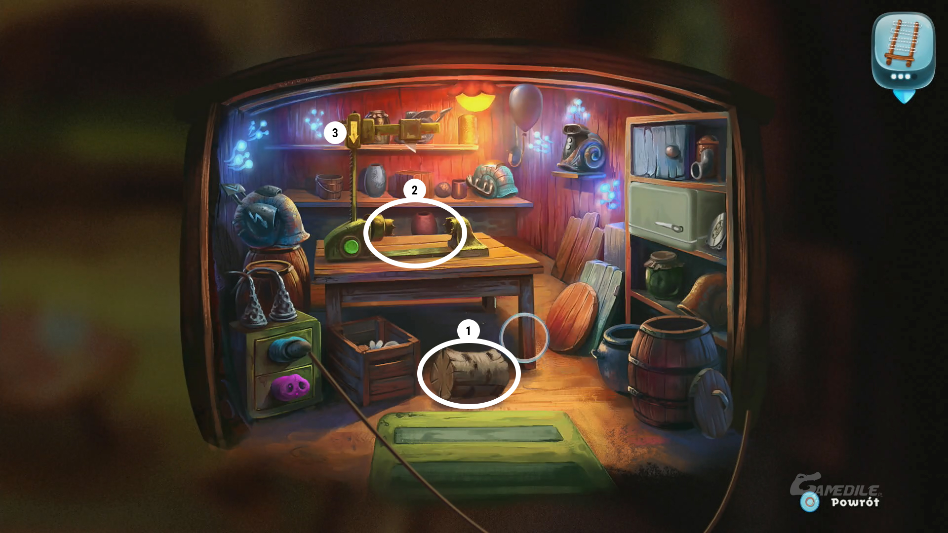 Tutaj wkładamy wtyczkę w pierwsze gniazdko, a następnie podnosimy kłodę 1. Kładziemy ją na imadle 2, a następnie uruchamiamy maszynę 3. W ten sposób ostrzymy sobie przedostatni szczebel drabiny, który podnosimy. Aby zdobyć ostatni, przekładamy wtyczkę do drugiego gniazdka i podnosimy linijkę znajdującą się w skrzynce pod imadłem. Wracamy do pierwszego pomieszczenia i wychodzimy na górę, na powierzchnię.