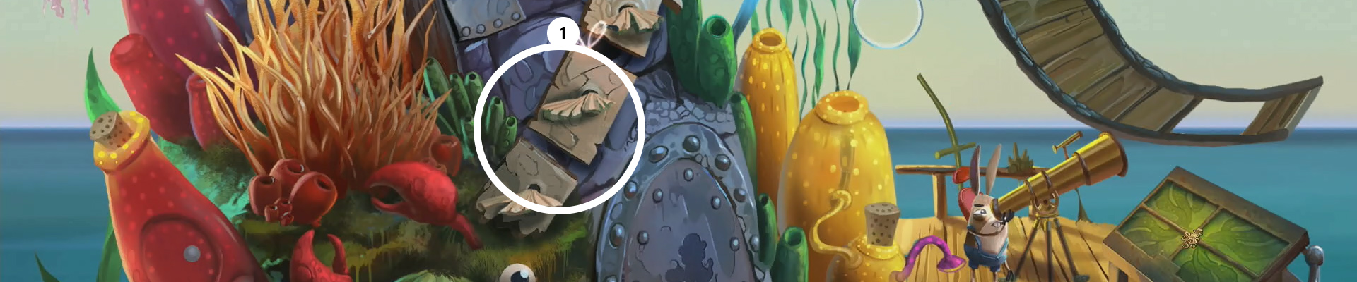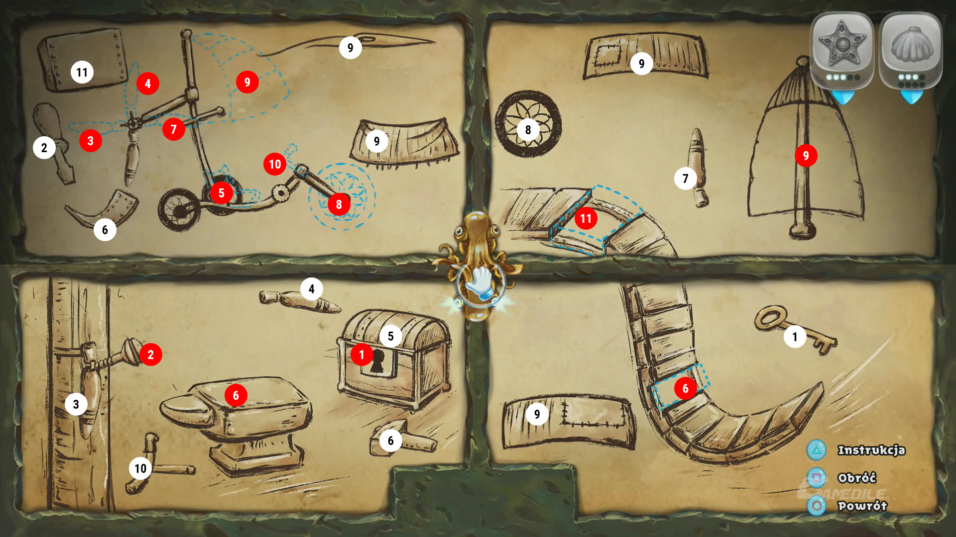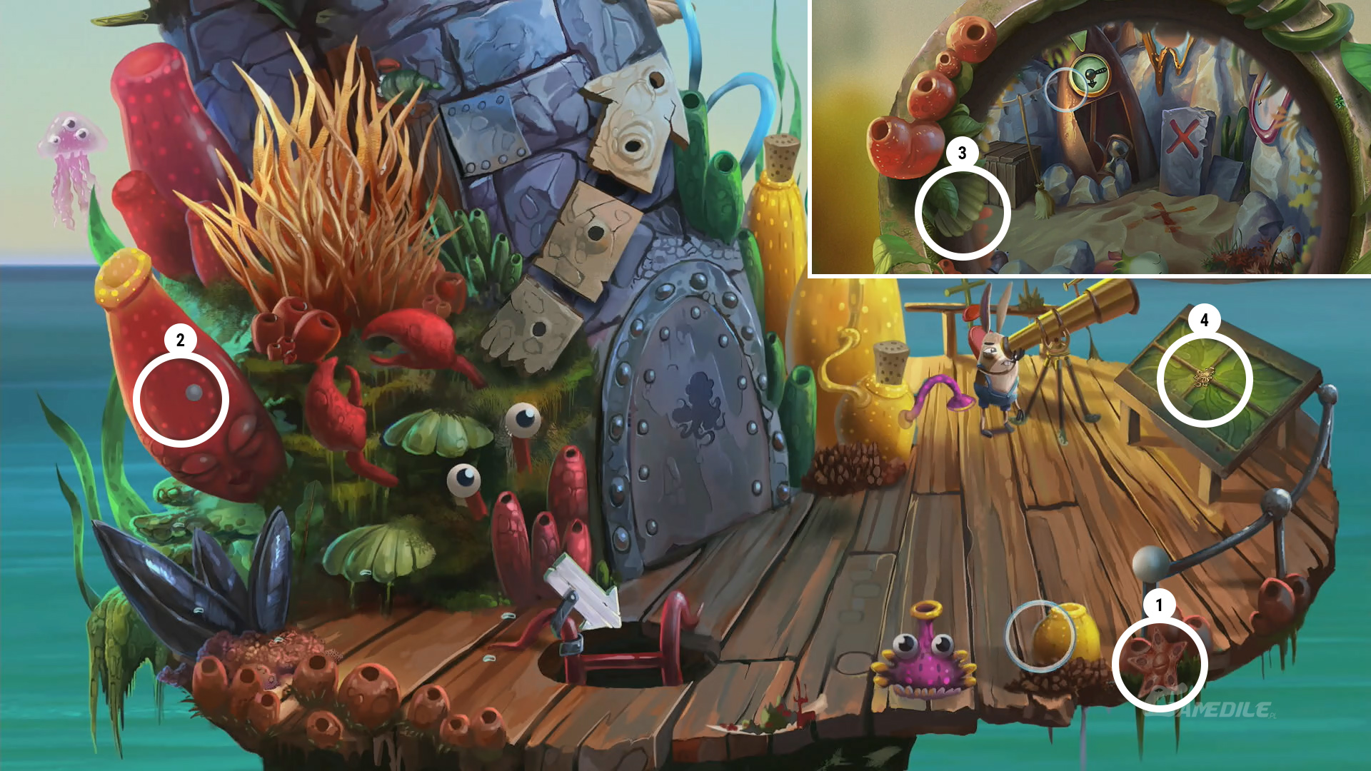 Na pierwszym planie po prawej stronie znajdziemy trzecią rozgwiazdę 1. Czwarta rozgwiazda 2 znajduje się z kolei w skrytce czerwonego kwiatu. Patrzymy przez teleskop. W jego obudowie, między liśćmi, znaleźć możemy trzecią muszelkę 3. Przystępujemy do rozwiązywania zagadki z kałamarnicą 4.