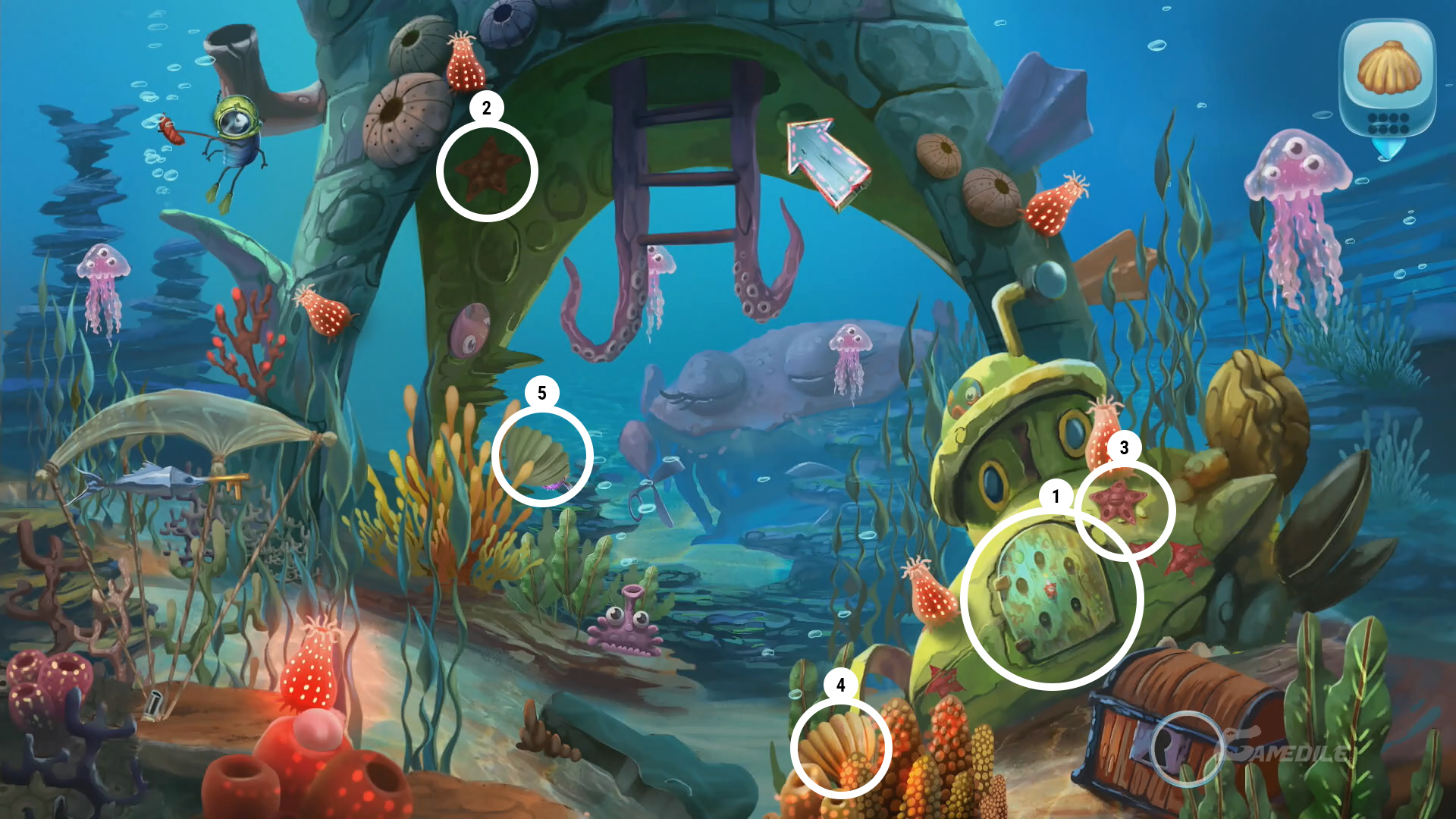 Tutaj spoglądamy na drzwi 1 łodzi podwodnej - by rozwiązać zagadkę z nimi związaną będziemy potrzebowali pięciu rozgwiazd. Pierwszą rozgwiazdę 2 znajdziemy tuż obok drabiny wyjściowej. Druga rozgwiazda 3 znajduje się z kolei na samej łodzi podwodnej. Na pierwszym planie znajdziemy ukrytą pierwszą muszelkę 4. Drugą muszelkę 5 znajdziemy u podnóża wyjścia. Wracamy na powierzchnię.
