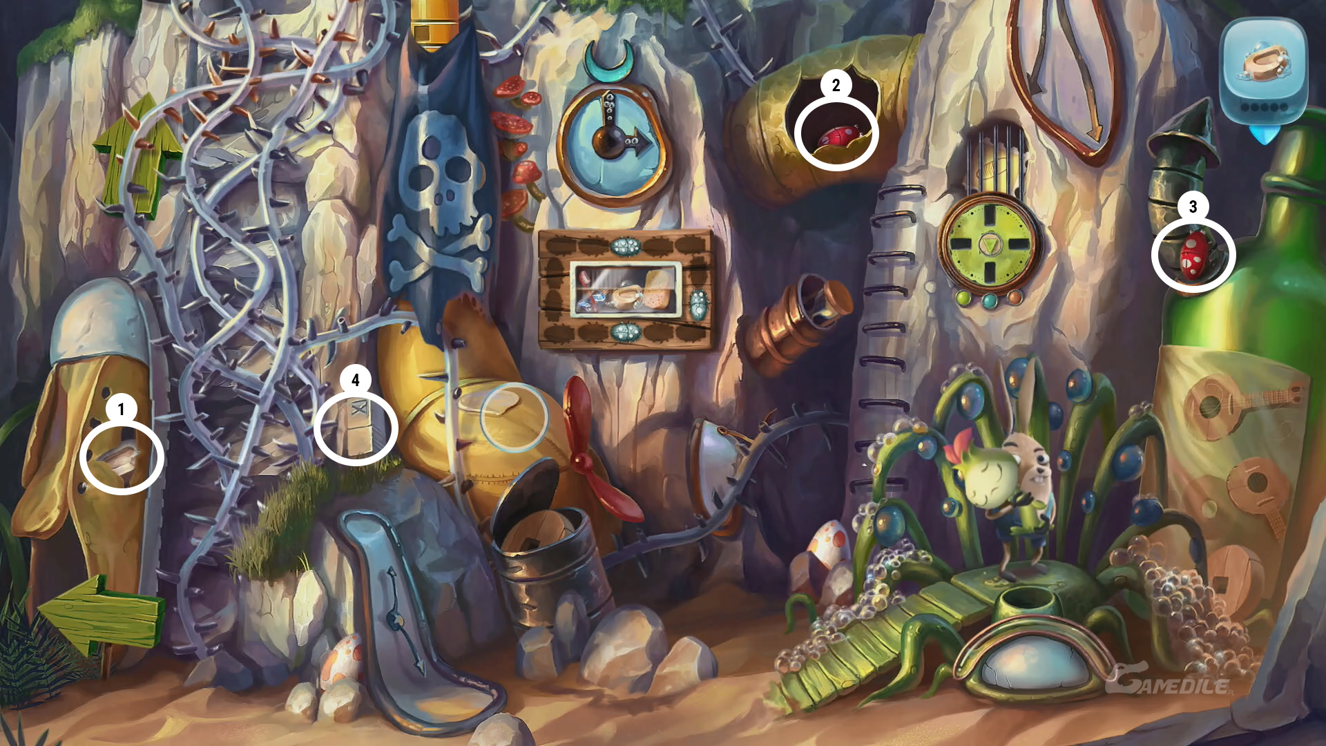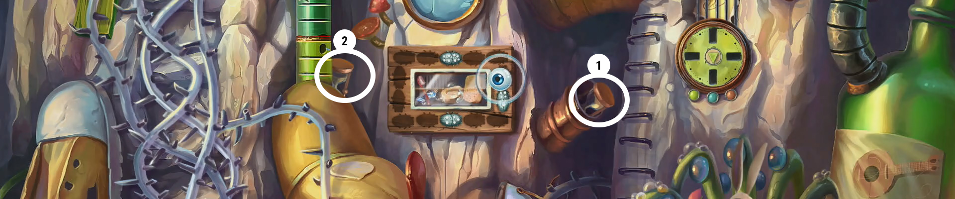 Od razu po pojawieniu się otrzymujemy pierwszy przedmiot do znalezienia - mydło. Przyglądamy się zagadce w centralnej części tej sceny - aby ją rozwiązać będziemy potrzebowali sześciu robaczków. Zerkamy także na zegaro-podobny okrąg nad bohaterami - do niego będą nam potrzebne cegły. Pierwsze mydło 1 znajdziemy w bucie po lewej stronie. Pierwszy robaczek 2 siedzi natomiast wewnątrz rury na górze. Drugiego robaczka 3 znajdziemy z kolei na rurze po prawej. Podnosimy także pierwszą cegłę 4. Zrzucamy piracką płachtę z urządzenia (zwracamy uwagę na zaznaczone symbole) i idziemy w lewo.