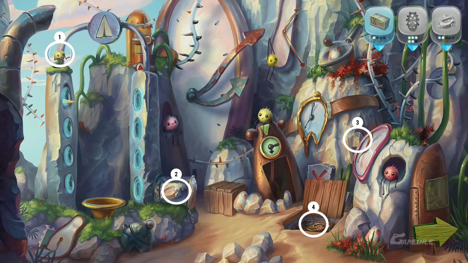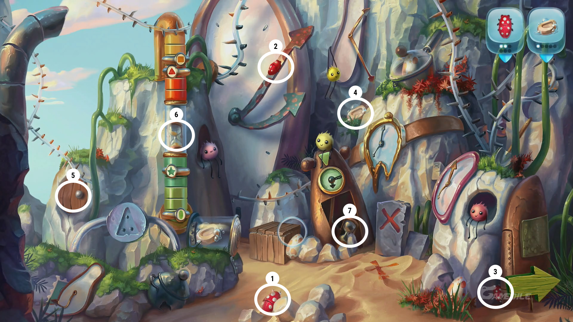 Podnosimy widocznego za kamieniami na pierwszym planie trzeciego robaczka 1, a następnie czwartego robaczka 2 znajdującego się na wskazówce - przyglądamy się zagadce na ziemi (wcześniej bierzemy leżącą po prawej stronie łopatę i kopiemy w zaznaczonym miejscu). Do naszej listy przedmiotów do znalezienia trafiają klepsydry. Podnosimy piątego robaczka 3 znajdującego się w prawym dolnym rogu. Zabieramy też drugie mydło 4 umiejscowione obok „roztopionego” zegara. Za drzwiczkami po lewej stronie znajdziemy pierwszą klepsydrę 5. drugą klepsydrę 6 - aby to zrobić przesuwamy symbole na kolejno (od góry) drugie, drugie, pierwsze i pierwsze miejsce. Trzecia klepsydra 7 znajduje się w zegarze niedaleko zagadki. Przechodzimy w prawo.