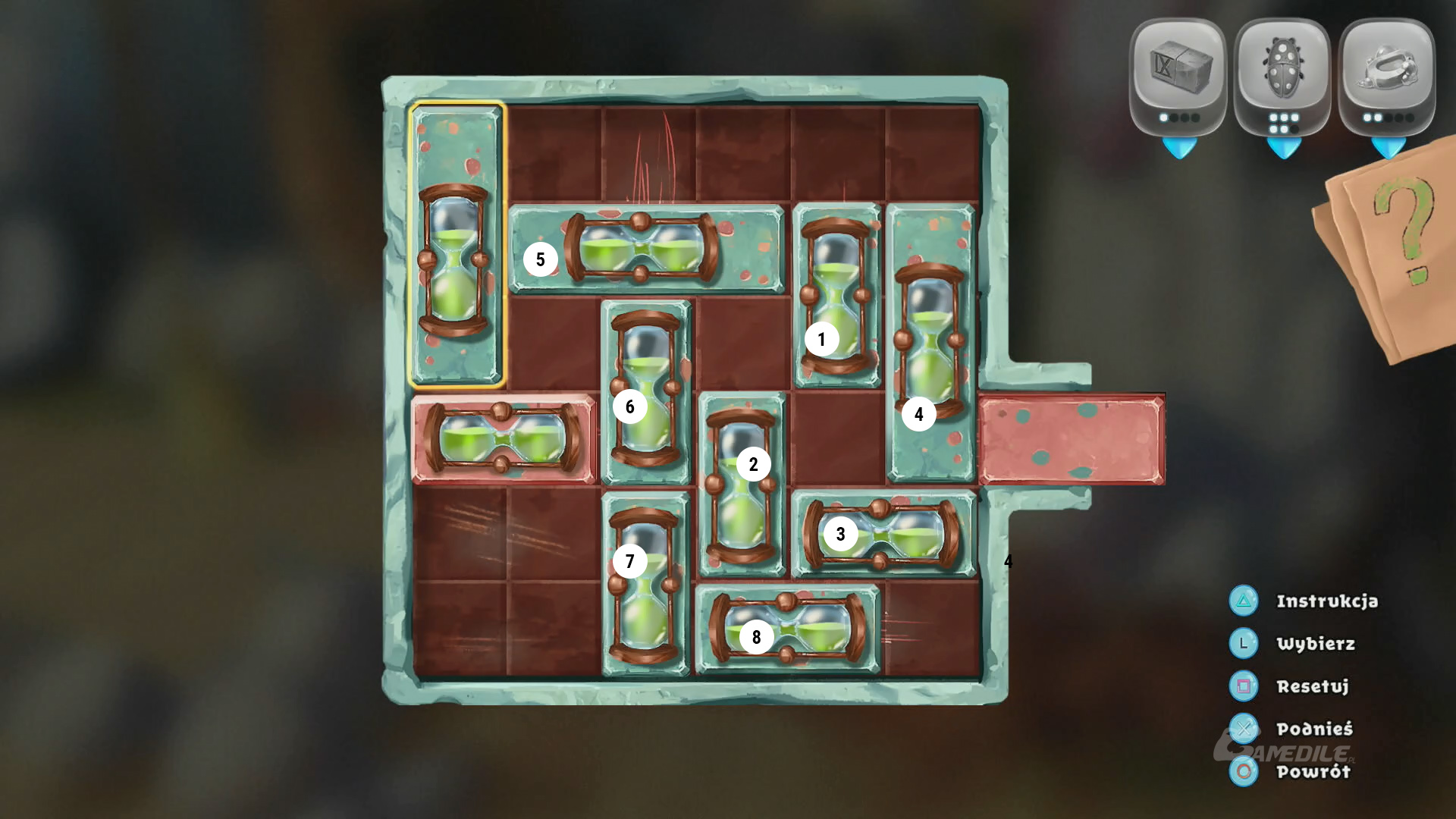 Naszym zadaniem jest przeprowadzenie klepsydry na czerwonym tle w prostej linii w prawo. Klepsydry, z którymi wchodzimy w interakcję na obrazku zostały zaznaczone cyferkami. Poniżej znajduje się przykładowe rozwiązanie: