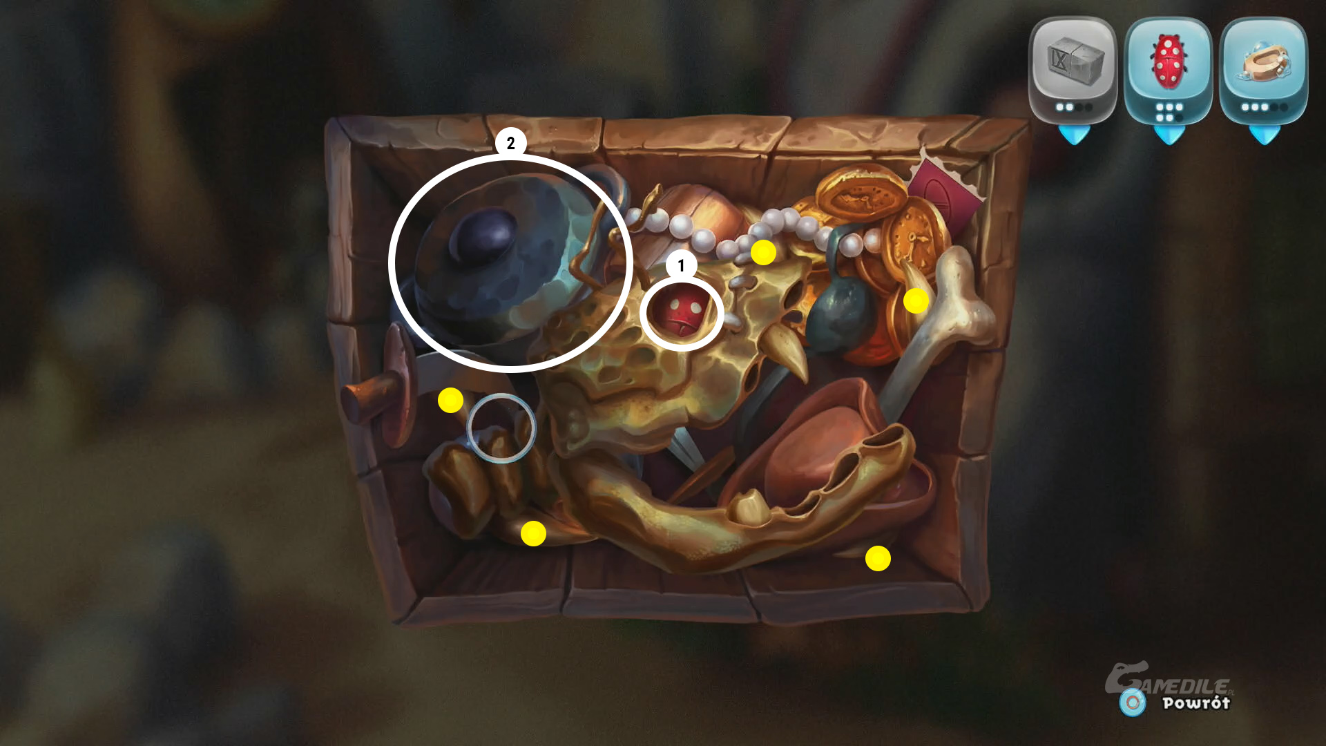 Tutaj podnosimy szóstego - ostatniego - robaczka 1 - zrobimy to po skompletowaniu kłów dinozaura i odstawieniu ich na miejsce. Wszystkie zostały pokazane żółtymi kropkami na obrazku. Otwieramy garnek po lewej i wyjmujemy z niego czwarte mydło 2. Wychodzimy z przybliżenia, idziemy w prawo i przystępujemy do wykonywania zagadki z robaczkami.