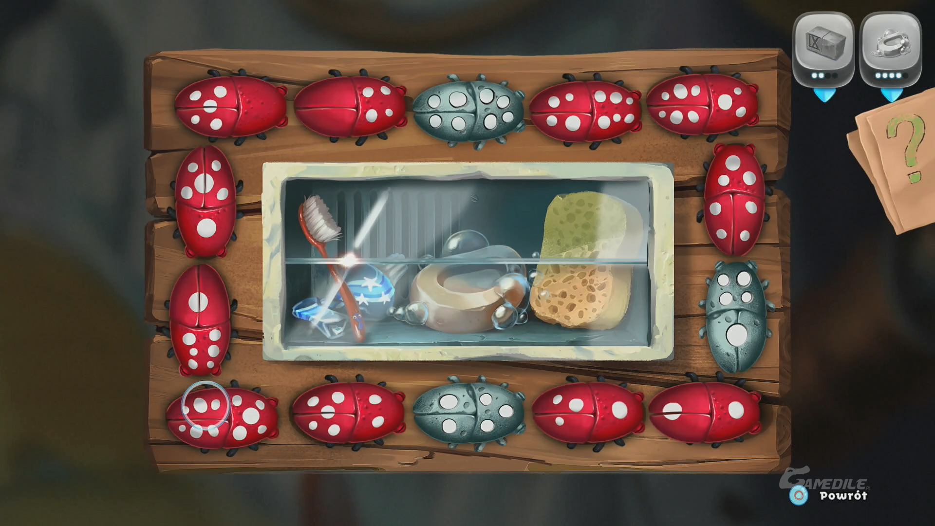 Nasze zadanie polega na takim ułożeniu robaczków, aby liczba kropek na ich ogonach i główkach zgadzała się z tymi na bezpośrednio do nich przylegających częściach ciała innych robaczków. Przykładowe rozwiązanie prezentuje powyższy obrazek. Po ukończeniu zagadki zabieramy piąte (ostatnie) mydło. Używamy go na bohaterach - kolejna zagadka zmusi nas do powtarzania symboli podświetlanych pod nimi. Jeżeli wszystko pójdzie dobrze, wytworzy się bąbel i zabierze ich oboje na górę.
