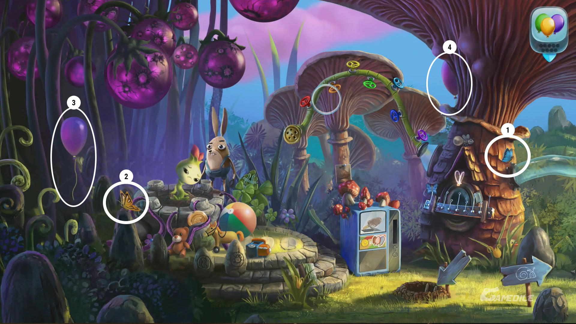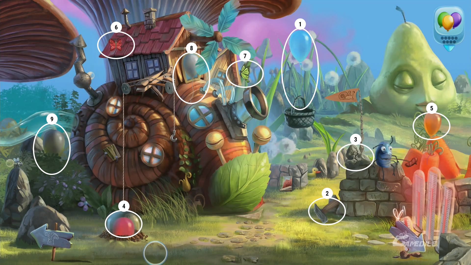 Od razu przyglądamy się termometrom w prawym dolnym rogu - są za gorące, a my musimy znaleźć lody, by je ochłodzić. Tymczasem jednak zabieramy niebieski balon 1 podtrzymujący koszyk - tego z kolei używamy na haku po lewej. Podnosimy młotek 2 i używamy go na kamieniach 3. Te z kolei umieszczamy w koszu, by podnieść kopułę chowającą czerwony balon 4. Nie zapominajmy również o tym, by podnieść tutaj pomarańczowy balon 5. Kończymy zbierając dwa motylki - czerwony motyl 6 znajduje się na dachu budynku, a jasnozielony motyl 7 - tuż obok. Nieopodal niego czeka kolejny balon 8. Następny, szary balon 9, ukryty jest za krzakiem po lewej. Wracamy do nory.