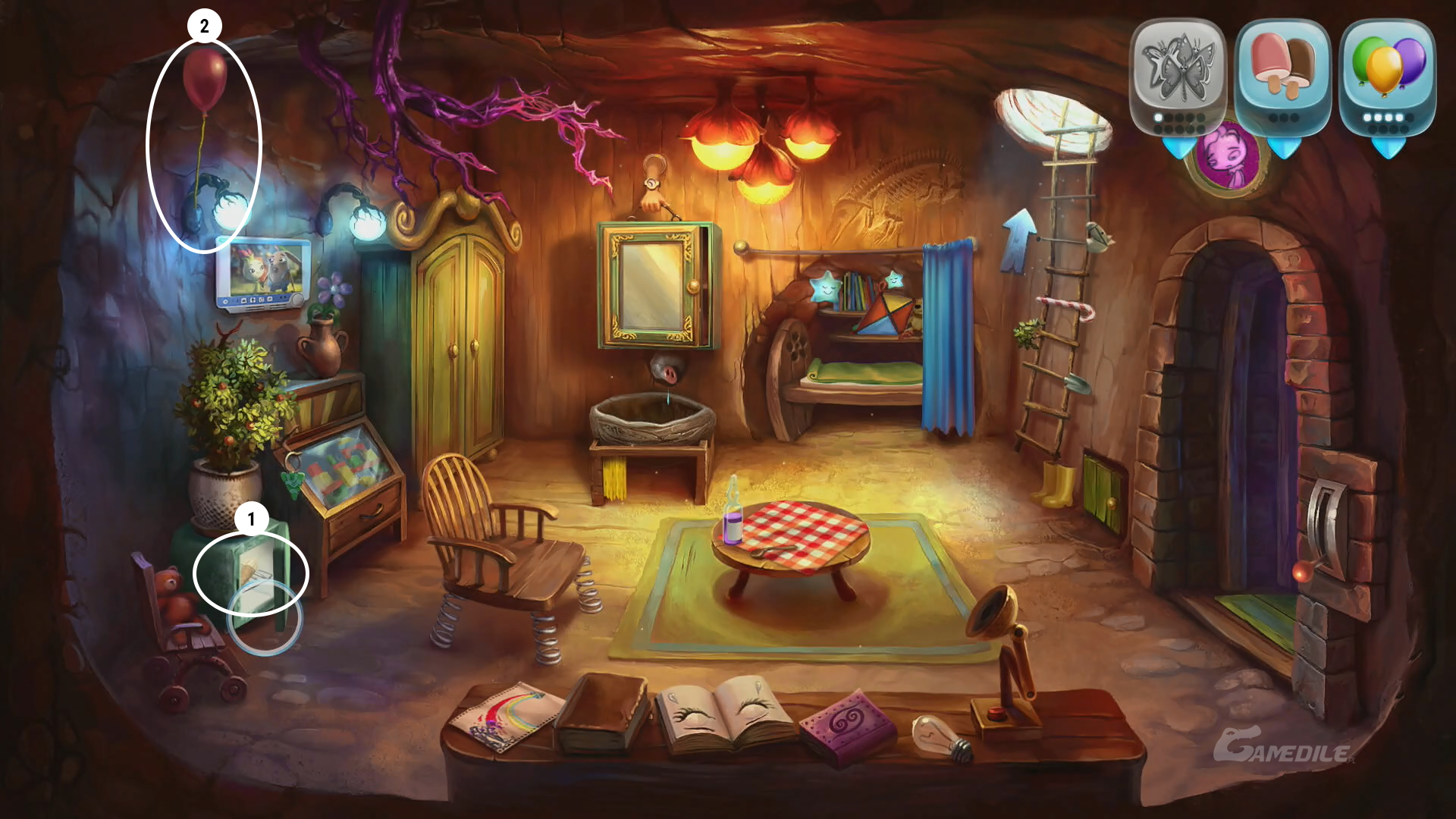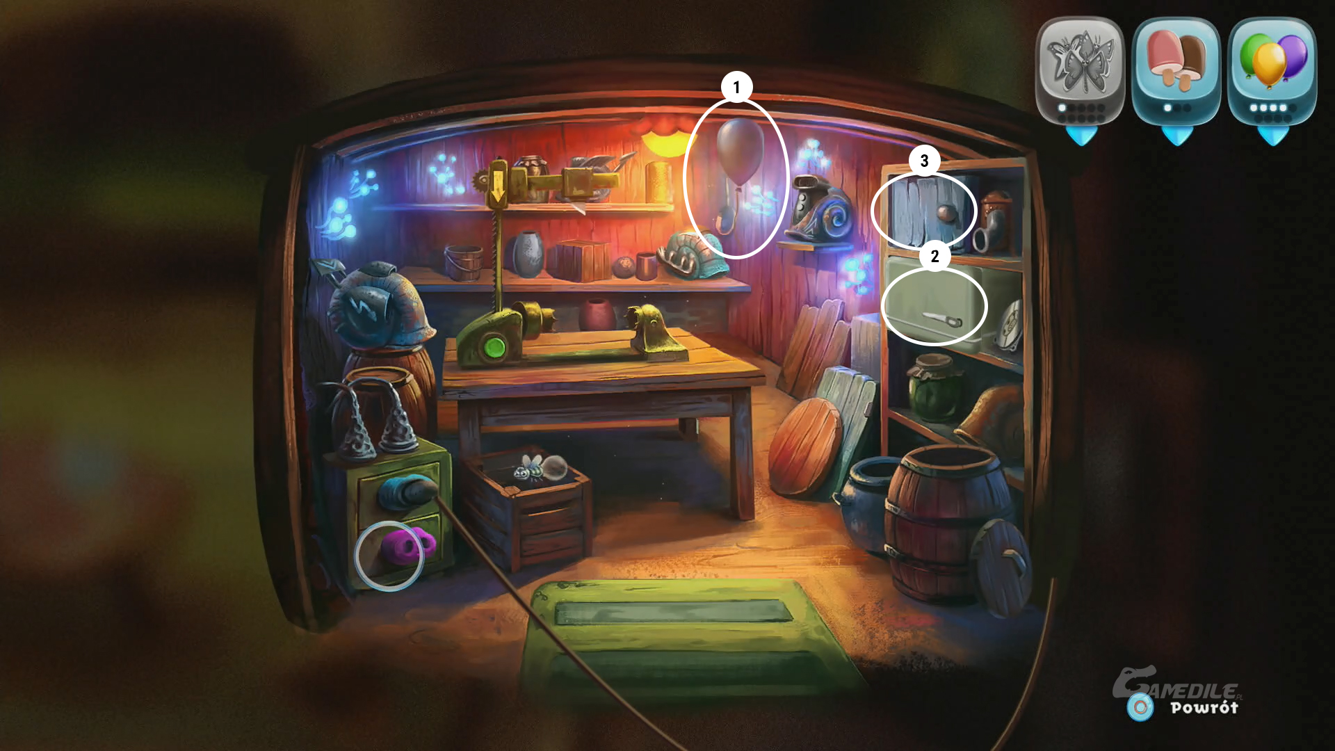 Z wtyczką włożoną w górne gniazdko, otwieramy beczkę po prawej stronie, z której wylatuje fioletowy balon 1, którego podnosimy. Otwieramy również lodówkę 2 po prawej stronie - czeka tam na nas drugi lód. Przekładamy wtyczkę do drugiego gniazdka i otwieramy szafkę tuż nad lodówką - w niej znajdujemy motylka 3. Jako że mamy już wszystkie balony, wracamy na powierzchnię.