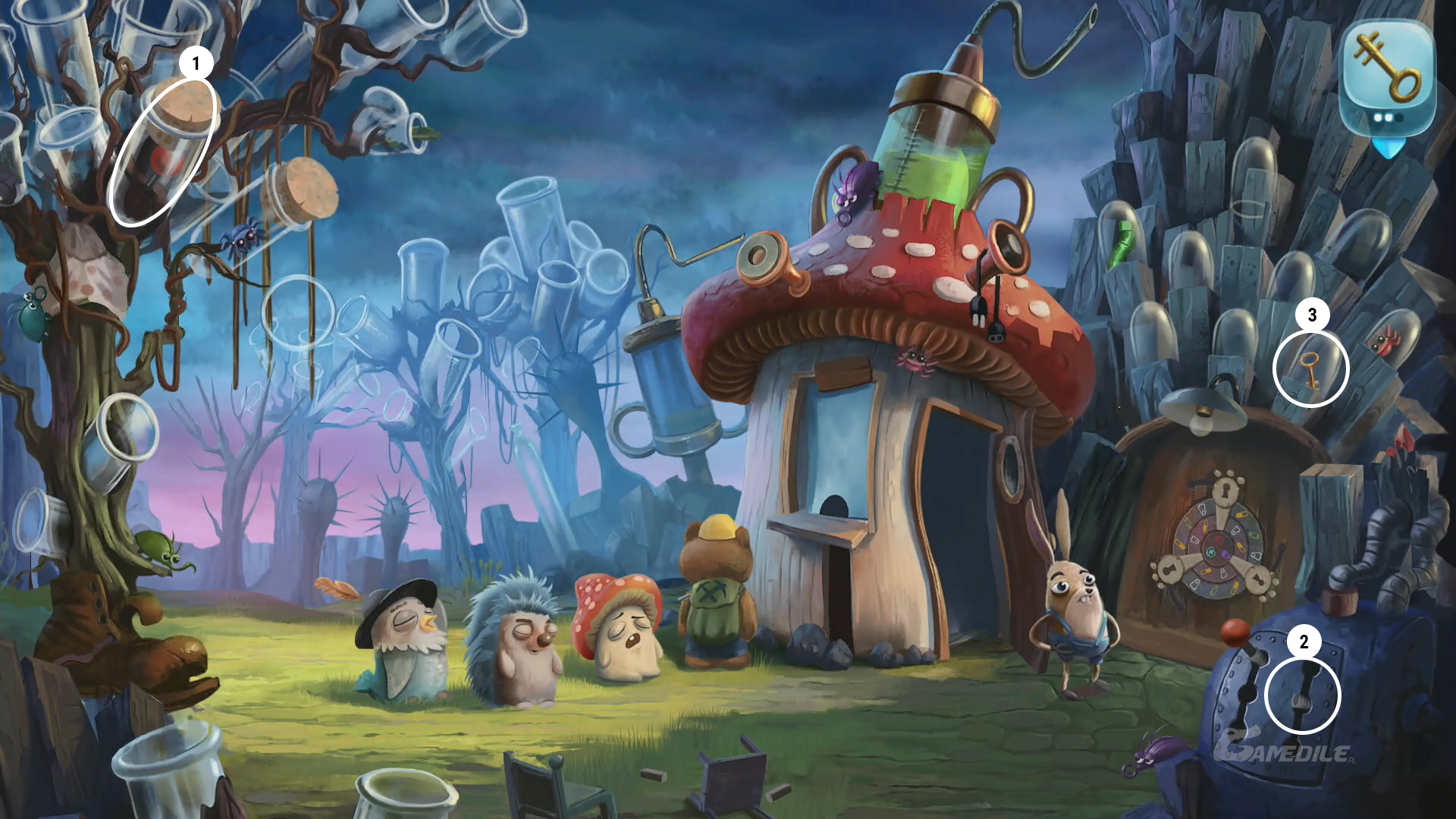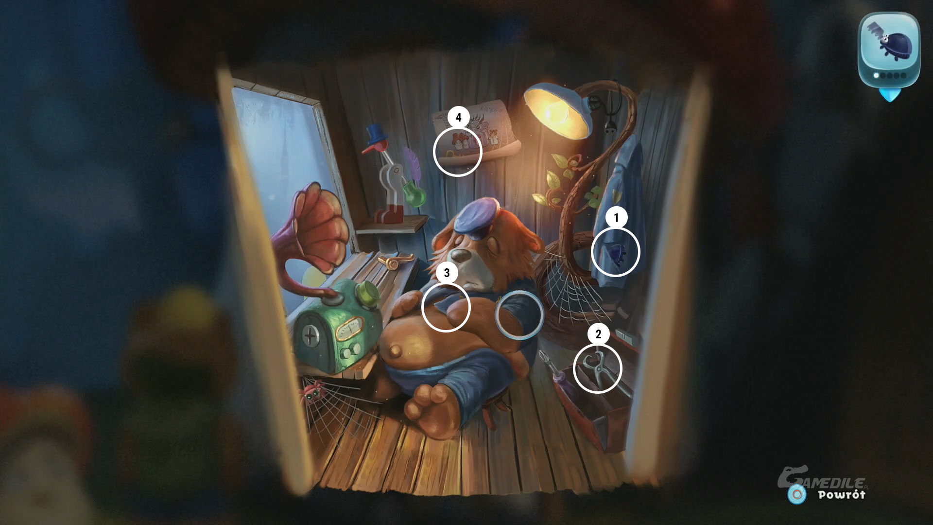 Przesuwamy dźwignię w górę i używamy klamki na drzwiach, dzięki czemu wchodzimy do muchomorowego domku i zastajemy tam drzemiącego strażnika. Łapiemy ostatniego żuczka 1 znajdującego się w jego płaszczu, a następnie chwytamy obcęgi 2 i obcinamy nimi pierwszy klucz 3, który znajduje się na jego szyi. Drugi klucz 4 znajdziemy w obrazku wiszącym na ścianie.