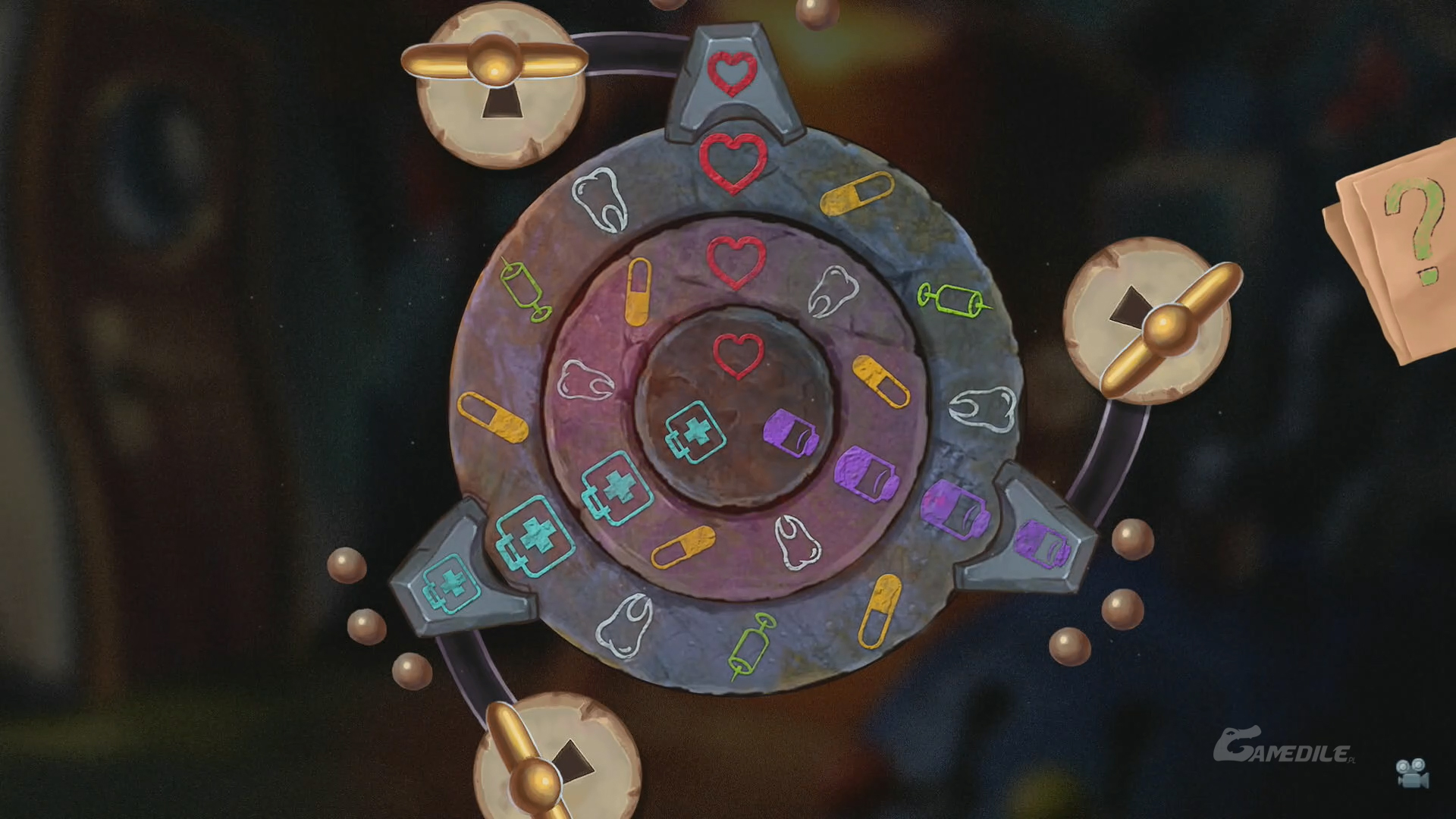 Naszym zadaniem tutaj jest ułożenie trzech zawartych w sobie okręgów w taki sposób, by symbole na każdym z nich zgrywały się w linii z tymi przedstawionymi w rogach maszyny. Najlepiej zacząć jest od najbardziej zewnętrznego okręgu, który przesuwa dwa pozostałe, a potem przejść na środkowy. Małym powinno się zająć na końcu. W ten sposób dostaniemy się do laboratorium.