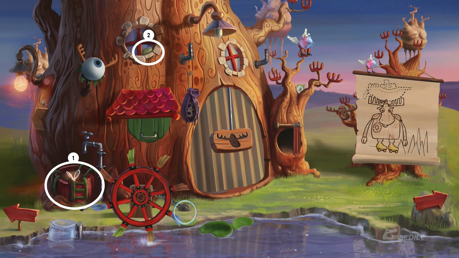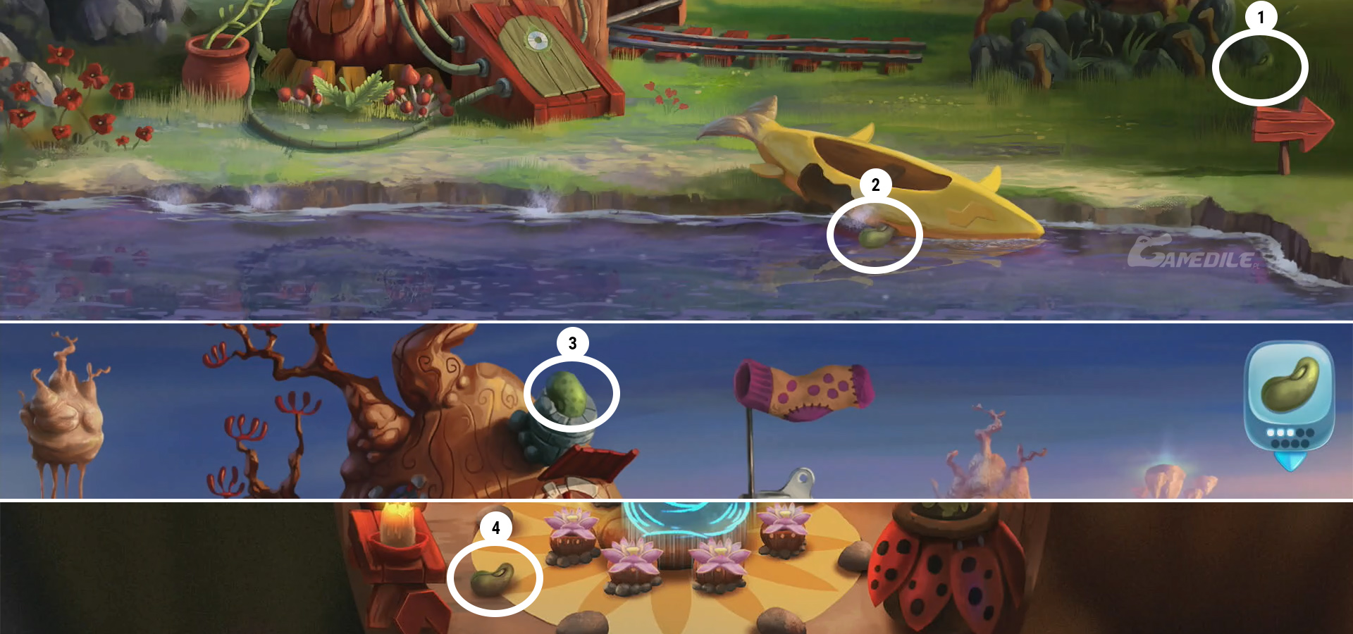 Druga fasolka 1 jest skrzętnie ukryta u podstaw budynku po prawej stronie. Trzecią fasolkę 2 znajdziemy przy motorówce. Po czwartą fasolkę 3 udajemy się do naszych bohaterów - umiejscowiona jest na dachu budynku. Wchodzimy do budynku i znajdujemy piątą fasolkę 4, która służy jako kamień dla łosia.