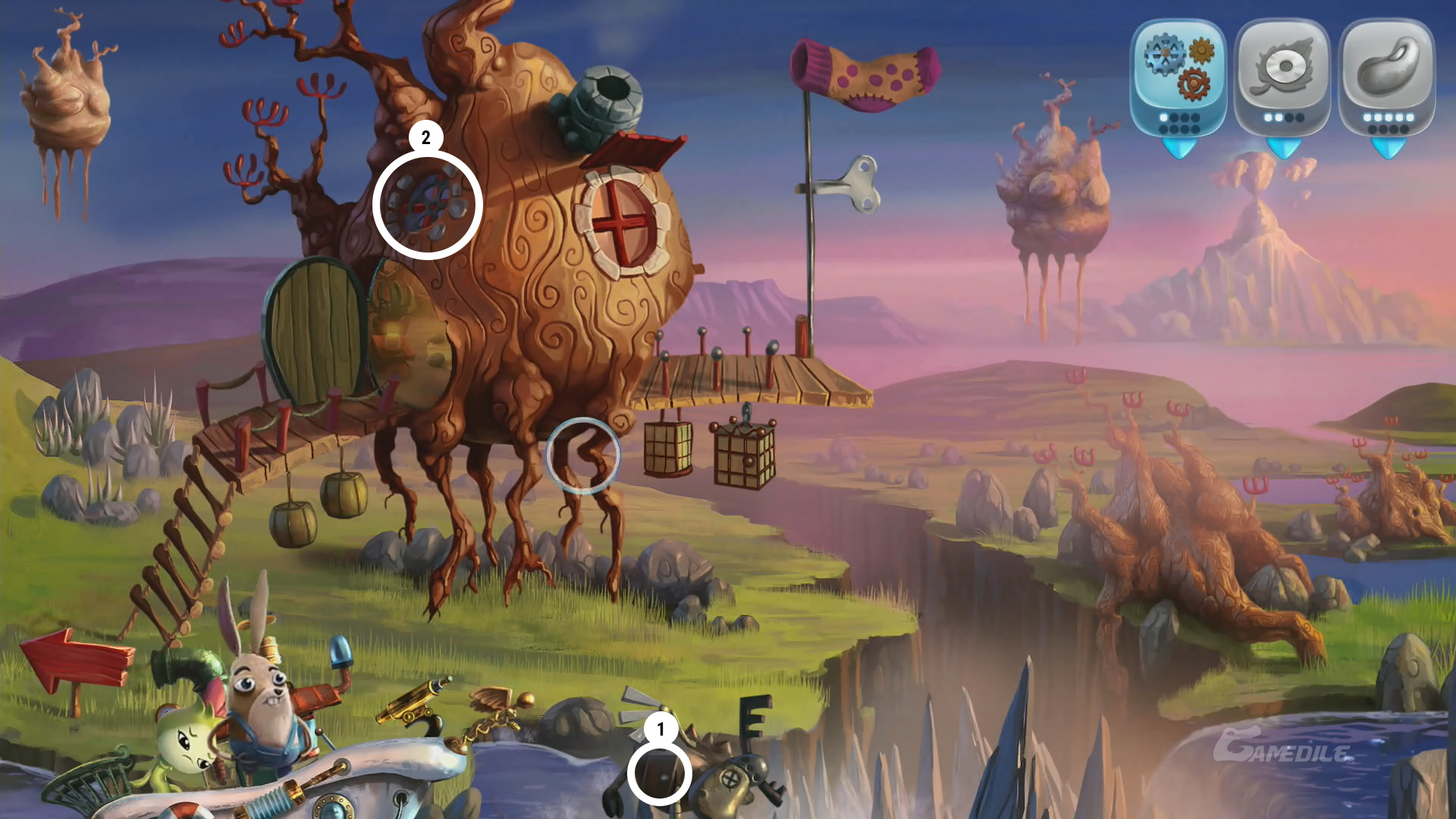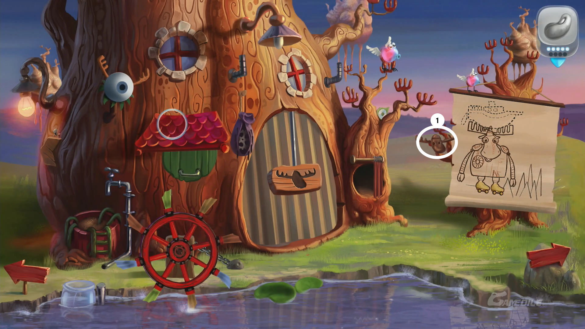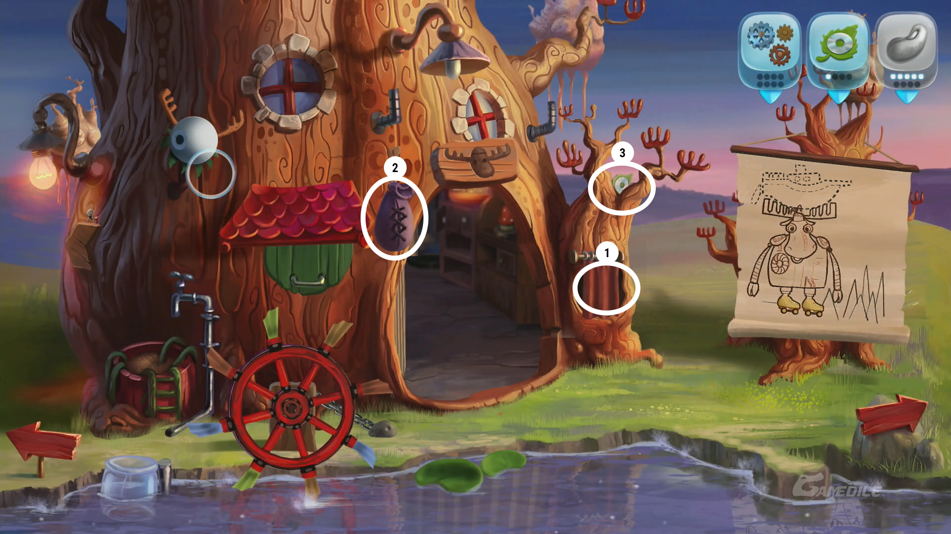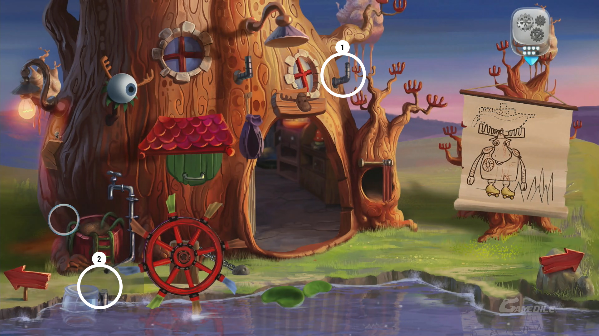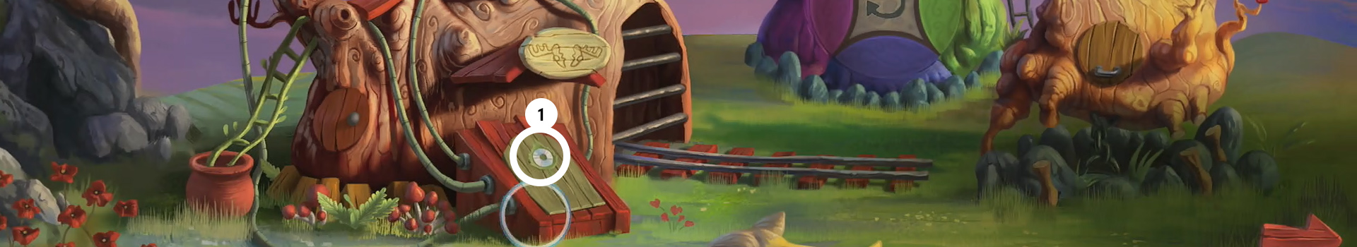 W środku, przyglądamy się językowi kameleona 1 oraz maszynerii na górze 2, by pozyskać wa nowe przedmioty do zbierania. Potrzebujemy czterech płytek na liściach oraz ośmiu kół zębatych. Podnosimy szóstą fasolkę 3 z szafki w lewym dolnym rogu, a siódmą fasolkę 4 odnajdujemy na rogu kameleona. Dbamy również o to, by podnieść pierwsze koło zębate 5.