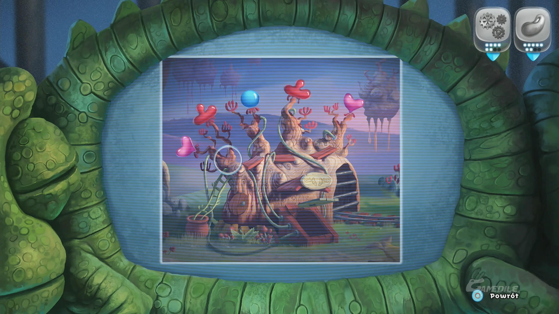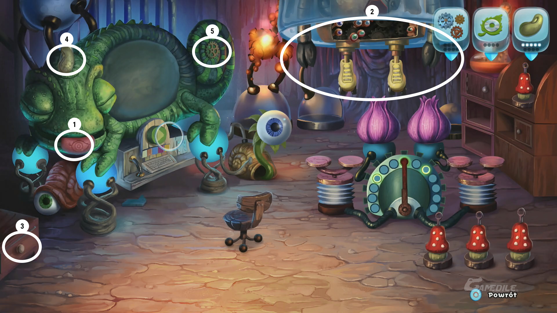 Idziemy w prawo. Pierwsza ampułka 1 znajduje się w lampie. Wchodzimy do pomieszczenia z kameleonem i otwieramy szafkę po prawej, z której wyciągamy drugą ampułkę 2. Teraz udajemy się do pokoju z duchem łosia, gdzie odsłaniamy biedronkową donicę - znajdziemy w niej trzecią ampułkę 3. Schodzimy do piwnicy na ekranie najbardziej wysuniętym na lewo. Na pierwszym planie otwieramy grill, w którym znajdziemy czwartą ampułkę 4. W tym samym miejscu, ale po prawej stronie odszukamy również piątą, ostatnią ampułkę 5. Wychodzimy na zewnątrz i korzystamy z ampułek, by otworzyć komorę. Podnosimy ostatnią fasolkę.