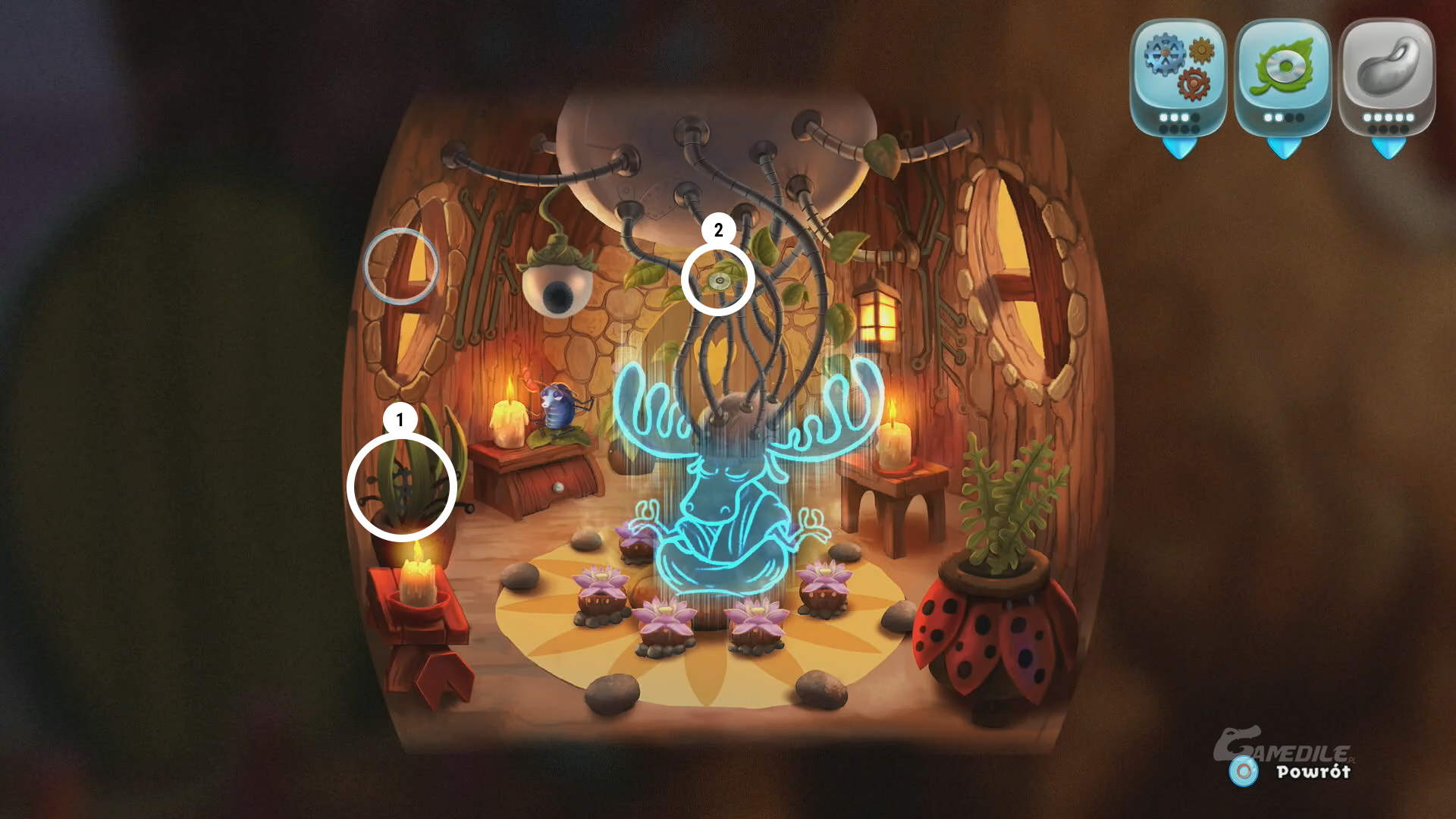W kwiatku po lewej stronie znaleźć możemy szóste koło zębate 1. Zanim wyjdziemy, zabieramy także czwartą (ostatnią) płytkę na liściu 2. Wracamy do pomieszczenia z kameleonem i używamy wszystkich płytek na nim. Przystępujemy do rozwiązywania zagadki.