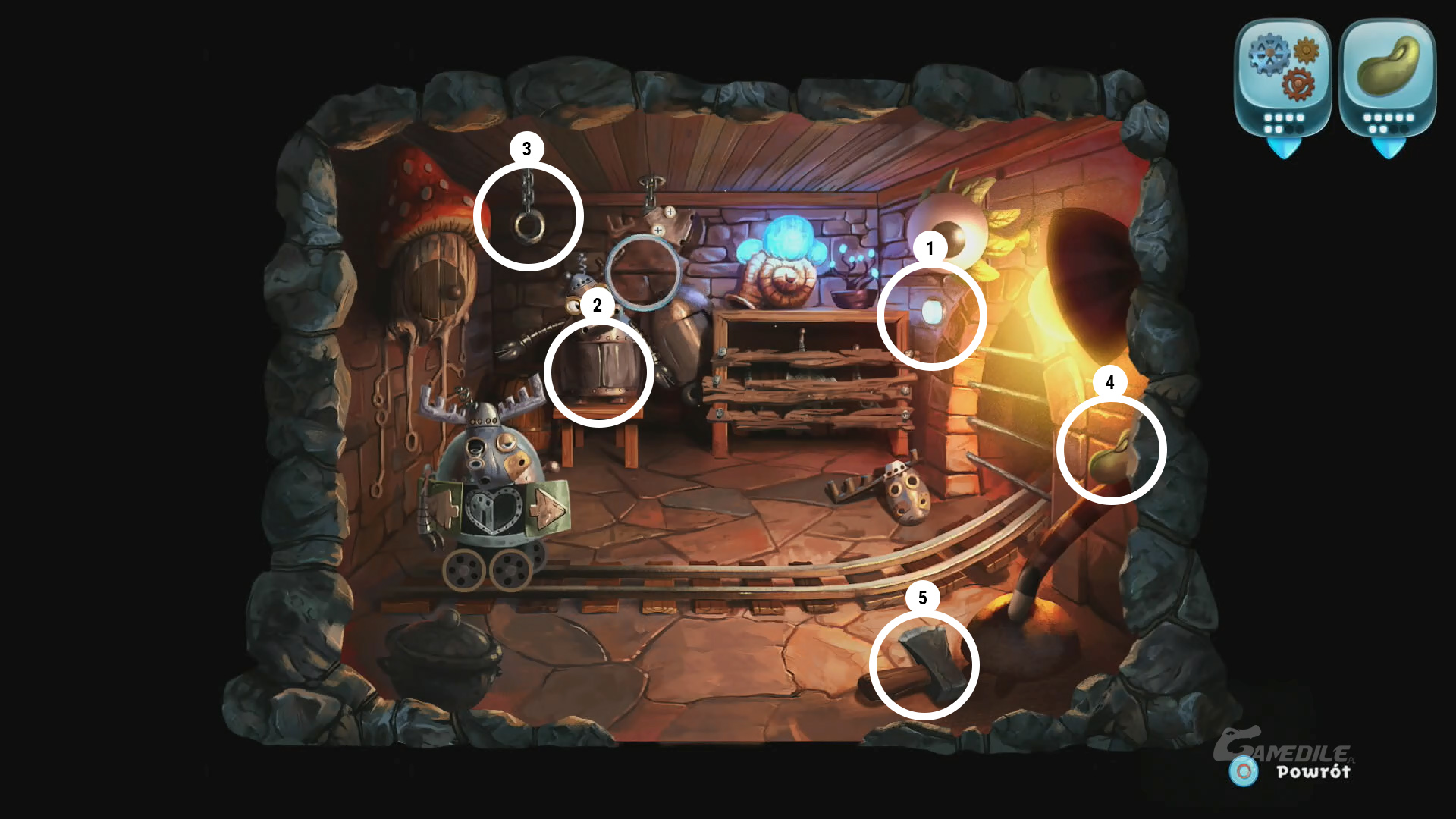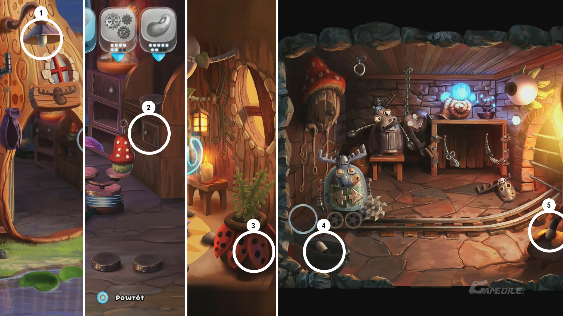Od razu po wejściu wciskamy przycisk 1, by rozświetlić pomieszczenie. Z robota z tyłu wyjmujemy serce 2 i umiejscawiamy je w robo-łosiu na szynach. Pociągamy za łańcuch na górze i z opuszczonej głowy łosia wyjmujemy siódme koło zębate 3. Zabieramy siódmą fasolkę 4, a następnie używamy siekiery 5, aby zniszczyć deski pod ślimakiem. Wyposażamy łosia w piłkę (środkowe narzędzie) i każemy mu wybrać się w prawo. Powinien przeciąć drzewo, do którego wracamy i na które spoglądamy celem otrzymania kolejnej zagadki. Do jej wykonania będziemy potrzebowali pięciu ampułek.