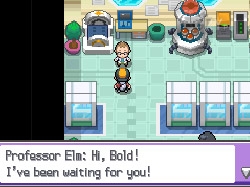 Czas udać się po naszego pierwszego Pokemona, z którym będziemy kontynuować naszą przygodę (i który będzie za nami podążał, przynajmniej na początku zabawy). W tym celu idziemy do Laboratorium (budynek w lewym górnym rogu). Spotykamy tam Profesora Elma - mówi, iż możemy dokonać wyboru Pokemonów, podchodząc do stanowiska z Pokeballami. Po chwili dostaje e-maila na temat znalezienia jaja jakiegoś Pokemona - Profesor prosi, byśmy udali się na miejsce wydobycia i dowiedzieli się czegoś więcej. My tymczasem podchodzimy do Pokeballi i dokonujemy wyboru. Oto, jakie mamy możliwości:
