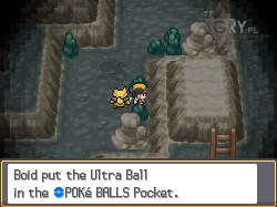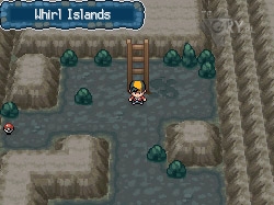 Jak widać ta jaskinia jest już zupełnie rozświetlona. Podnosimy Max Revive leżące po lewej stronie, a następnie sprawdzamy na samej górze miejsce na ścianie pomiędzy dwiema skałami. Tam znajduje się Full Restore. Idąc w dół można napotkać na staruszka blokującego drogę - pilnuje on jej, gdyż znajduje się tam legendarny Pokemon. Na chwilę obecną nie będziemy się tym zajmować (posiadacze HeartGold zająć się tym mogą później niż ci posiadający SoulSilver - ja opiszę to później). To tyle jednak, jeżeli chodzi o Whirl Islands. Możemy wyjść, czy to korzystając z Escape Rope, które zdobyliśmy wcześniej, czy też wychodząc w normalny sposób. Teraz lecimy do Goldenrod City. Czas rozprawić się z Team Rocket!