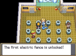 Trenerzy w tej Sali Gimnastycznej posługują się Pokemonami elektrycznymi. Rozpoczynamy od pokonania wszystkich "zwykłych" trenerów - w sumie rzecz biorąc jest ich trzech. Możemy przy tym stoczyć podwójną walkę, ale nie musimy. Zaraz potem przystępujemy do rozwiązywania zagadki (osobiście poszedłem jeszcze uleczyć Pokemony).