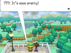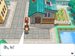 Po rozmowie z mamą opuszczamy budynek. Swoje kroki kierujemy w górę - zaczepi nas przy tym Hugh ze swoją młodszą siostrzyczką. Rozmawiamy z nim - postanowi nam towarzyszyć w drodze do Bianci. W związku z tym nasze możliwości zwiedzania miasta są, powiedzmy sobie szczerze, bardzo okrojone. Idziemy w górę, wybierając prawe rozwidlenie. Gdy dotrzemy do Centrum Pokemon, idziemy lekko w górę i w lewo, wchodząc po schodach tam umieszczonych (znajdują się tuż nad Centrum).