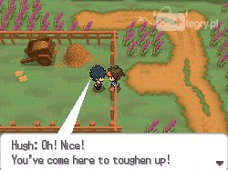 Tutaj od razu muszę wspomnieć, że warto zajrzeć w okoliczne krzaki (po lewej stronie od wejścia na ranczo). Znaleźć w nich można bardzo dobre poziomowo Pokemony, na których można nieco podtrenować. Ponadto możemy również rozważyć zdobycie kilku z nich - elektryczne z pewnością przydadzą nam się w trakcie przygody. W każdym razie gdy tylko uporamy się z łapaniem / trenowaniem, możemy wrócić się i uleczyć własne stworki. Jeżeli tego nie potrzebujemy, przechodzimy przez dziurę w płocie nieco powyżej. Zaczepi nas Hugh! Czas na kolejny sprawdzian naszych umiejętności!