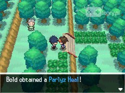 Od razu kierujemy się w prawo, w stronę najbliższego mostu. Czeka nas tutaj pierwsza walka z przypadkowo spotkanym trenerem. Jego Patrat nie powinien być dla nas wyzwaniem. Po wygranej walce kontynuujemy w prawo - czeka już tutaj na nas dziewczyna chcąca zawalczyć. Pokonujemy ją i podnosimy leżące powyżej Parlyz Heal. Jest to przedmiot, który leczy wybranego przez nas Pokemona z irytującego statusu zwanego paraliżem.
